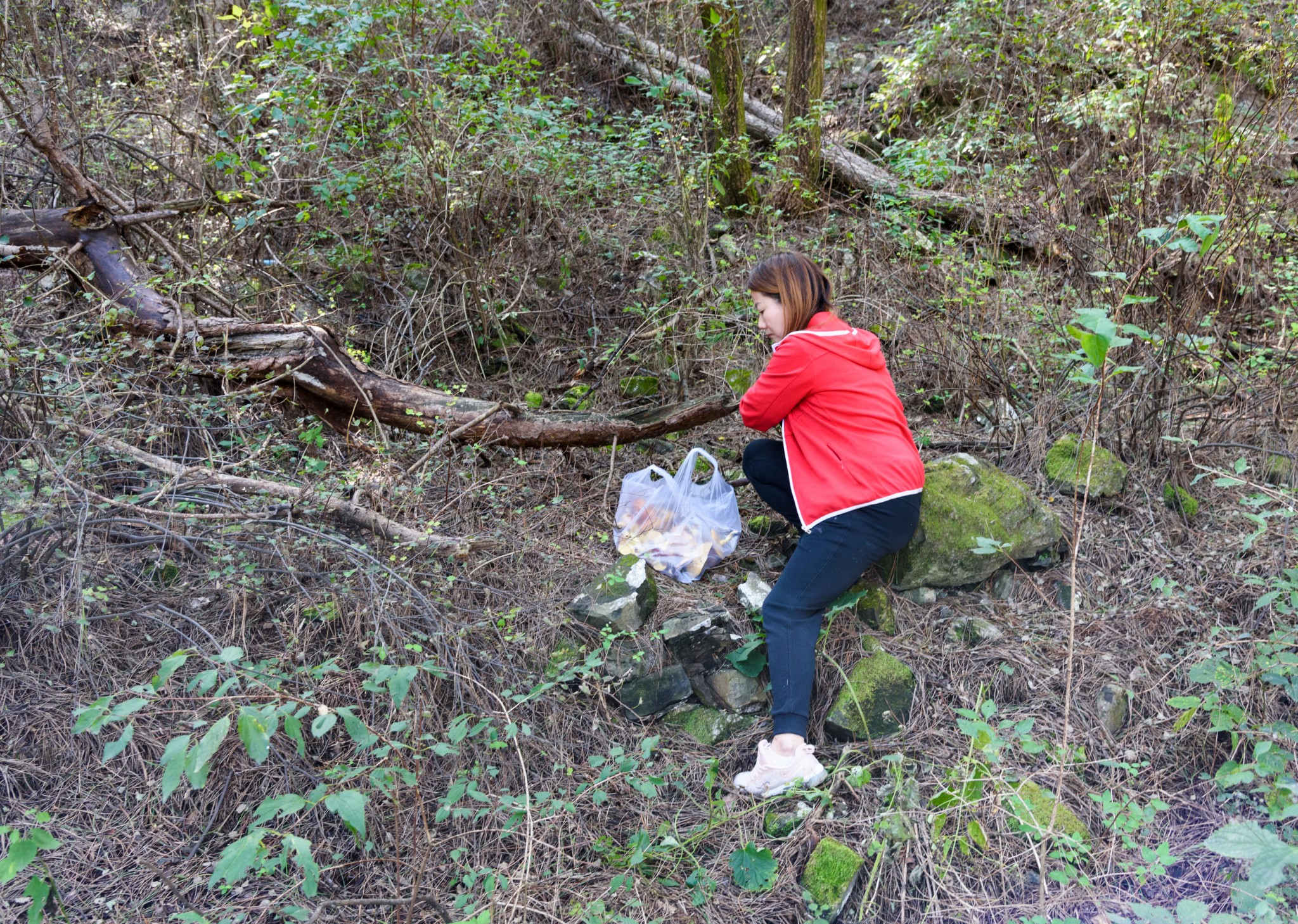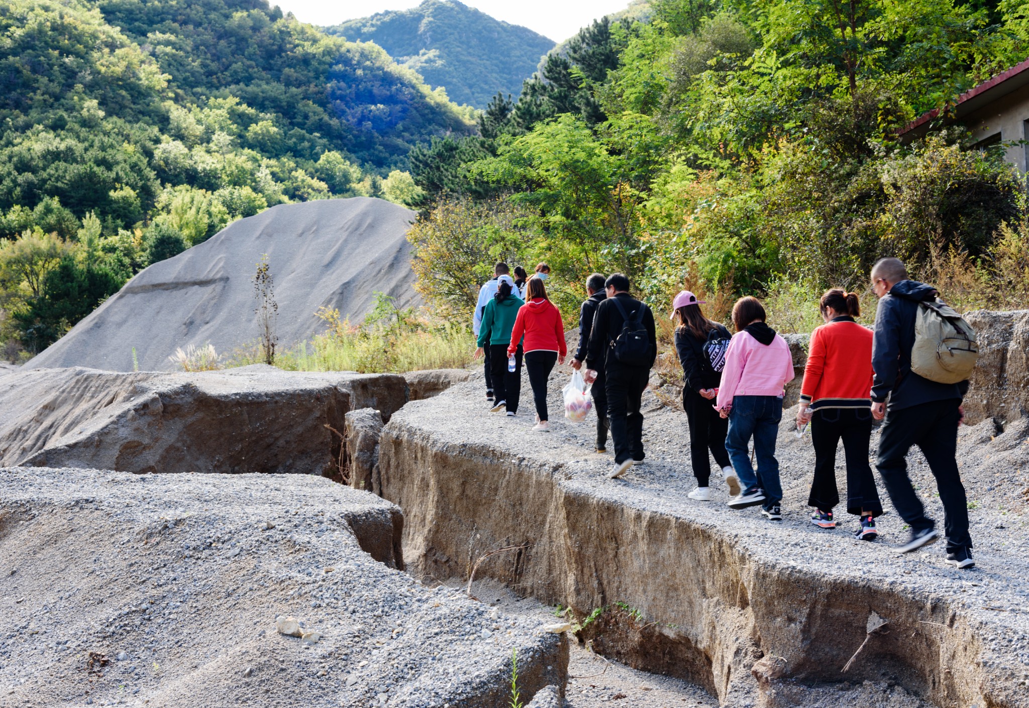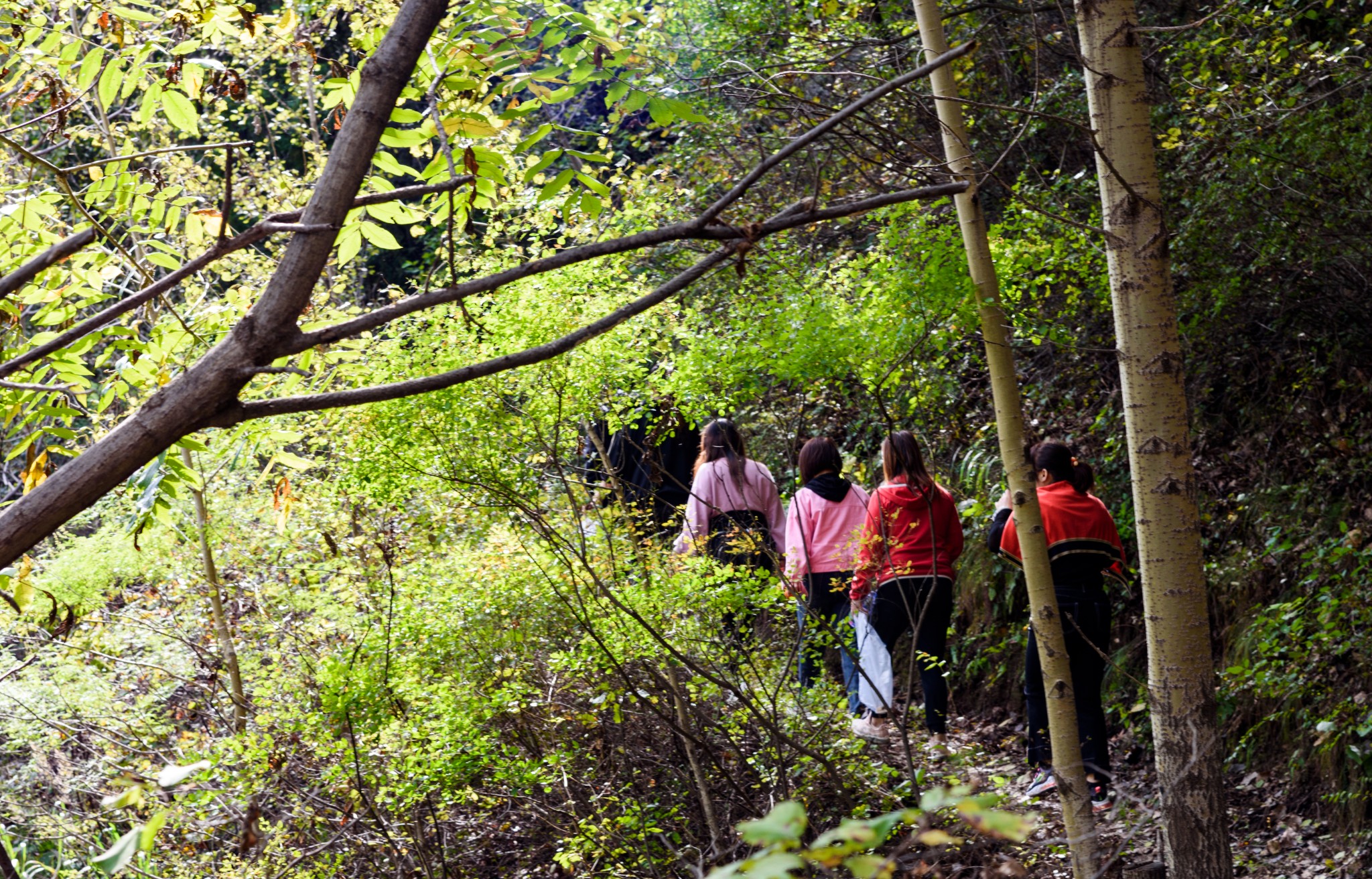 我们一行十多人,为了把握起见,花一百块钱请了一位村民大哥带着我们上山。今年雨水大,山路被冲得沟壑纵横。我们一行欢歌笑语,顺山谷进山。