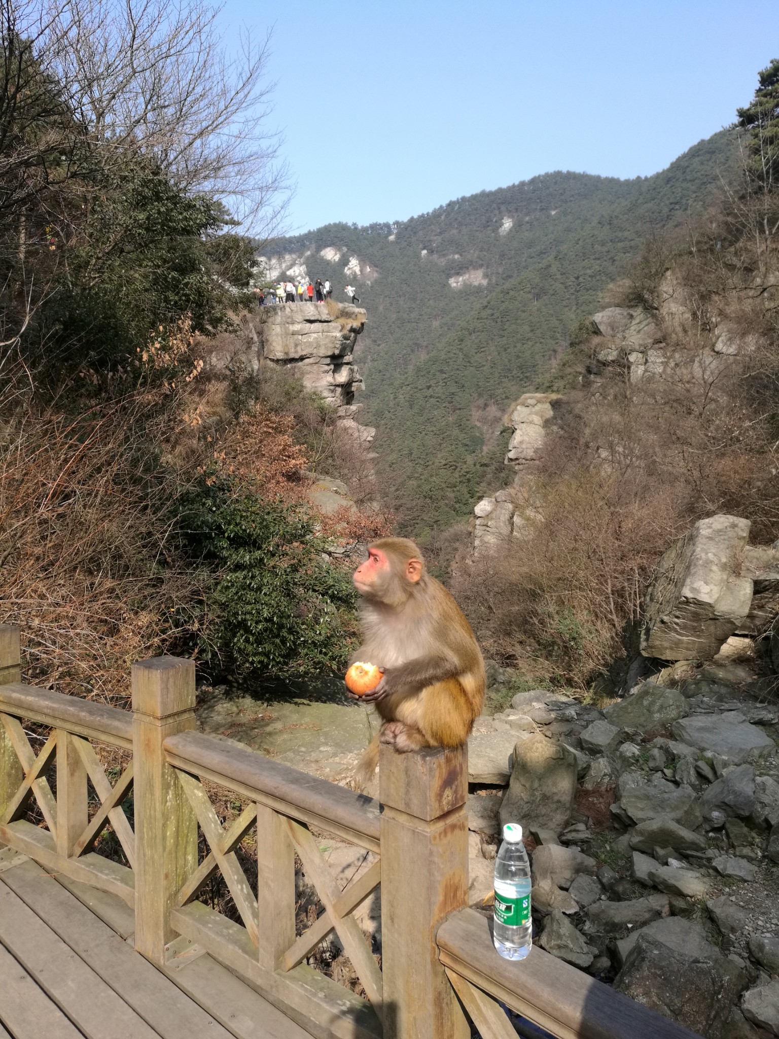 这只猴子抢了我吃了一口的苹果,当时去前面拍照了,苹果放在栏杆上面,这只猴子不知从哪冒出来的。