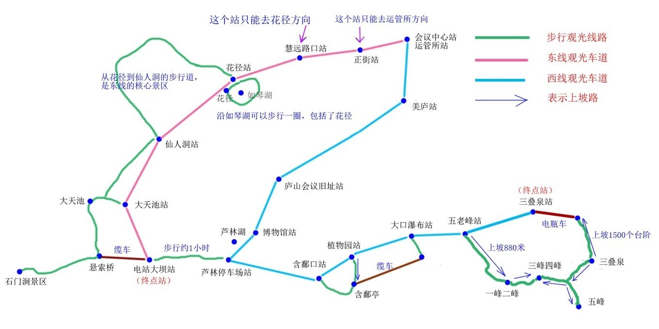 庐山山上分东、西两条线(见上图),西线包括的景点有如琴湖、锦绣谷、花径、仙人洞、芦林湖、黄龙潭、乌龙潭、三宝树等,休闲路线,比较轻松。