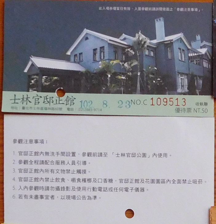 士林官邸全票NT 100元,二十人以上可购买团体票NT 80元。优待票NT 50元,