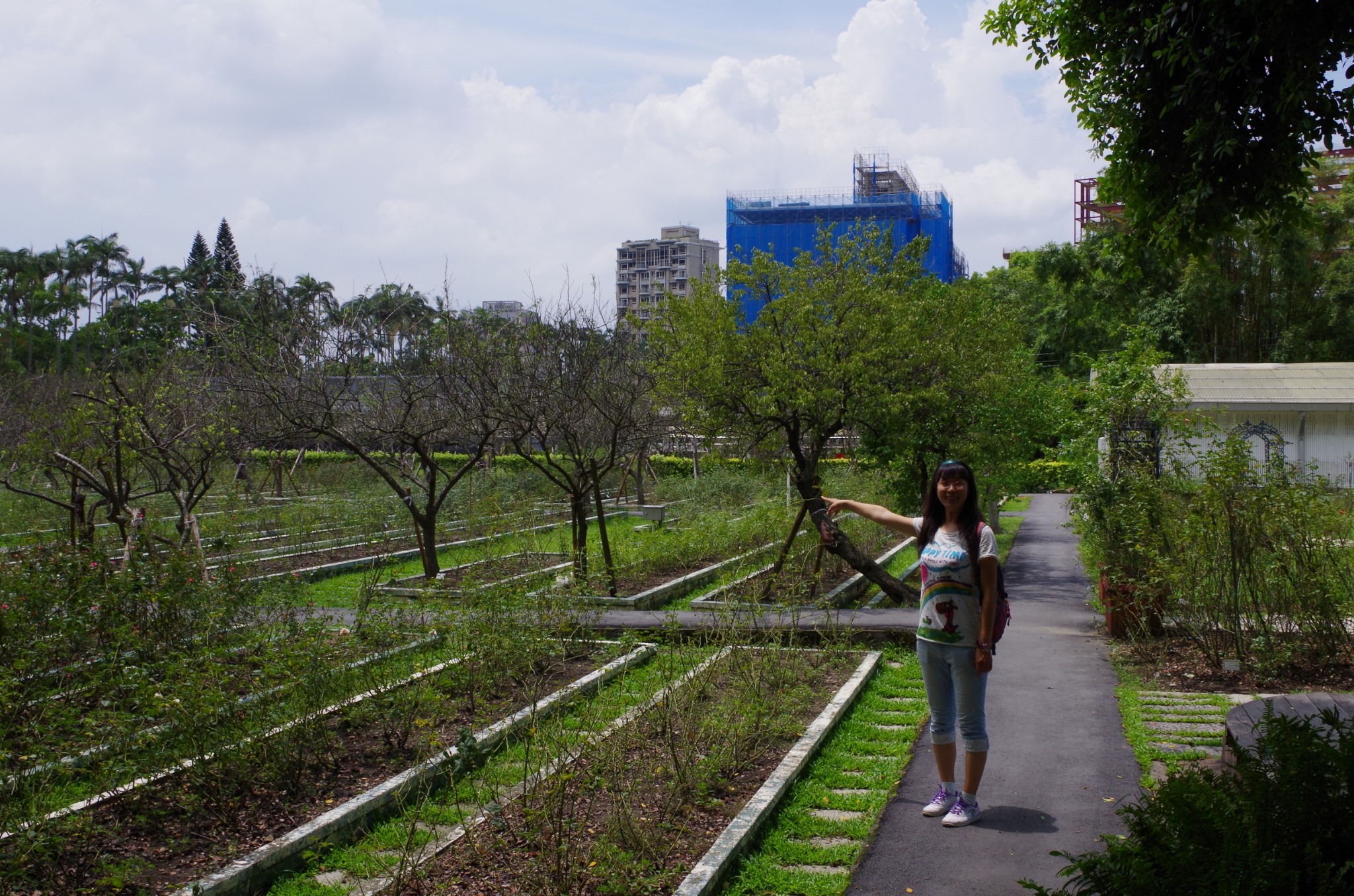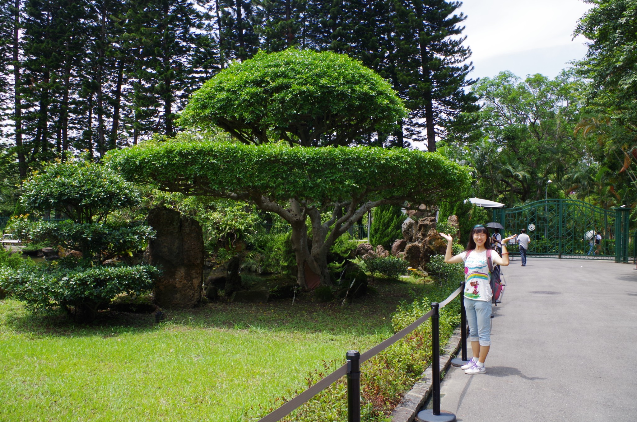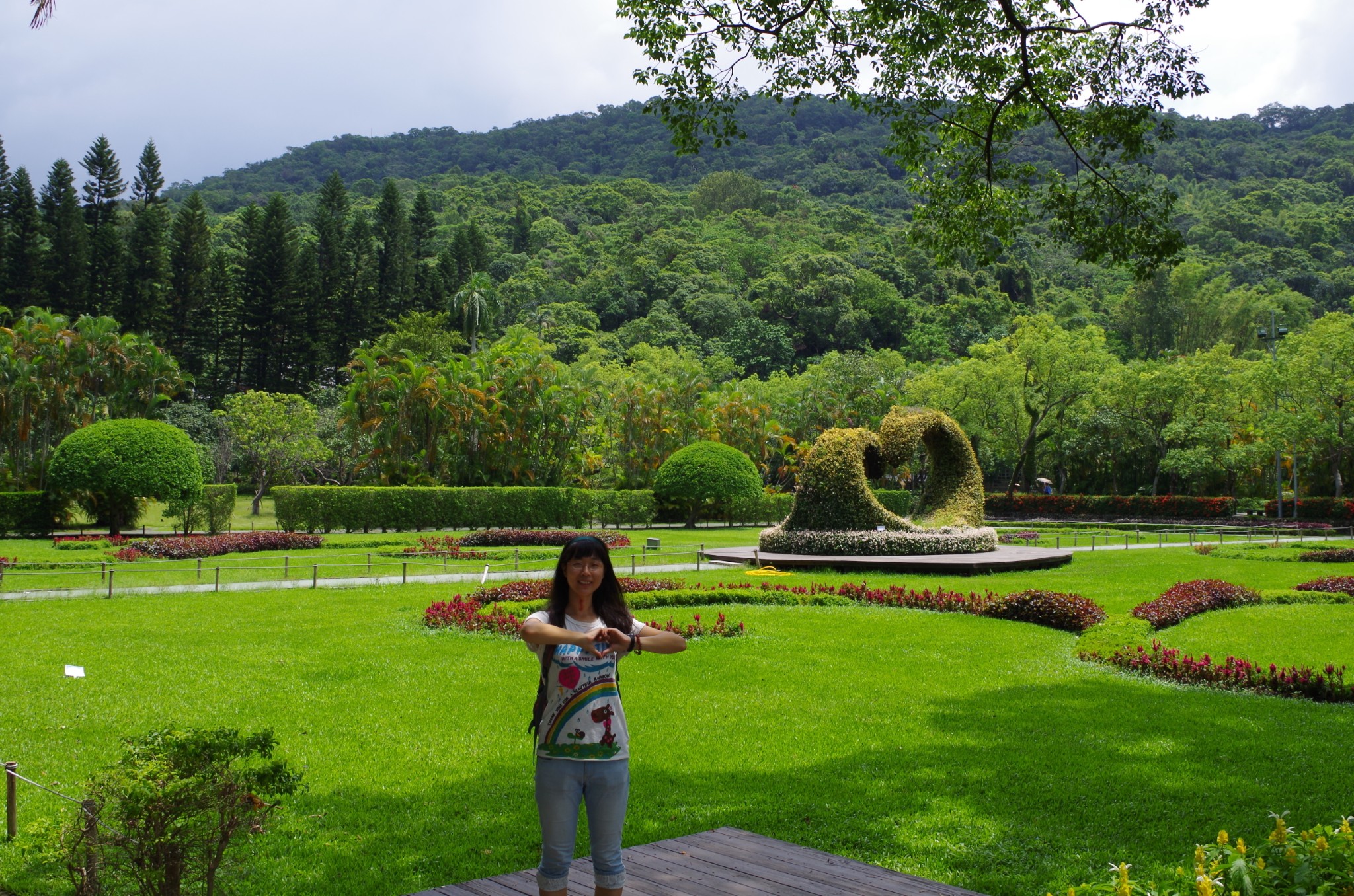 有一处园艺,修剪的很像一个心形。我比出的心形手势,可是当年流行的样子呢。