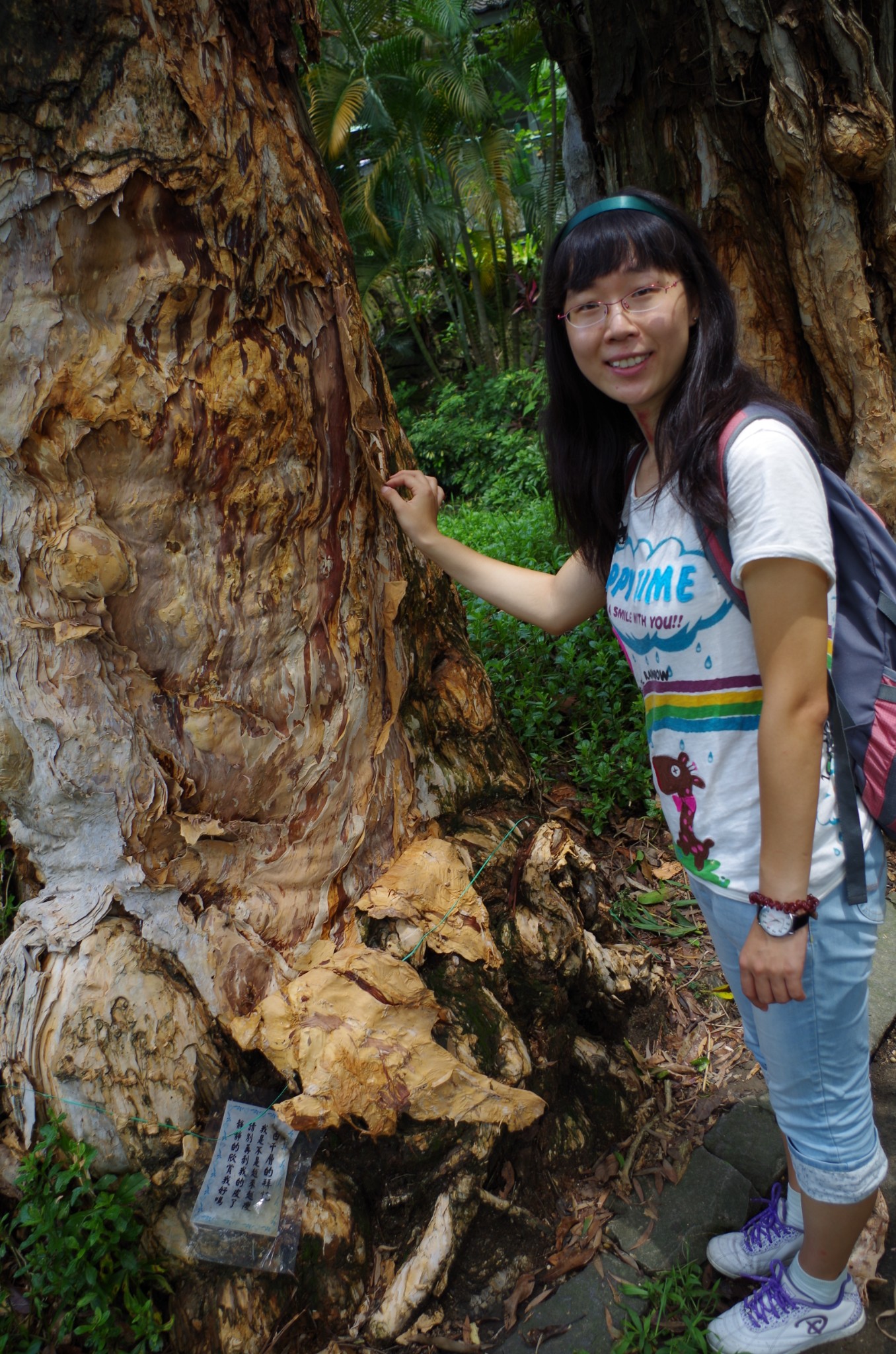 我走近看了看,没有忍住,摸了一摸,单层的树皮很厚实。