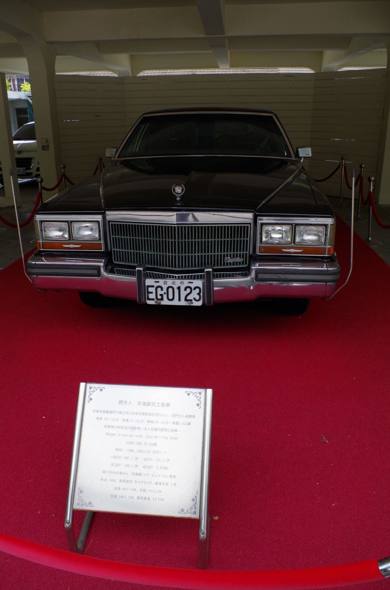 “本车系美国通用汽车公司1988年份制凯迪拉克5031cc,四门七人座轿车,车长647.7公分,车宽191.2公分,车高144.4公分,车重3.4公吨,该车为1988年至2003年间,夫人使用之座车。”