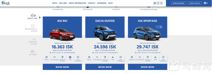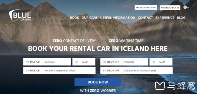 一切准备齐全以后,就剩下最后两步:租车和取车。在冰岛租车特别方便,很轻松就可以在线上完成。拿我们租车的网站 bluecarrental.is来说,进入网站之后,首先选择租车的时间,取车和换车的地点,