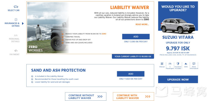 然后选择需要的租车保险。这里需要注意的是冰岛特有的Sand and Ash Protection保险并不是包含在基础价内的,但是非常建议上一下,尤其是如果你的行程包括冰岛南部,有一定的可能性会遇到sand and ash storm,买一下心里放心一些。除此之外,我们还在Allianz保险买了一个Liabiility Waiver,来保证所有未知的车辆损坏都能被保险cover。
