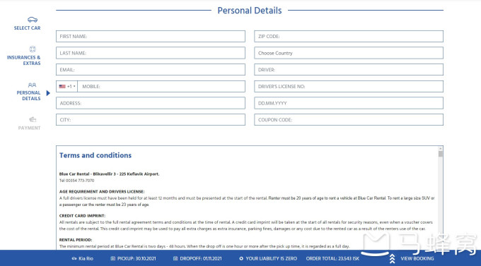 最后填写个人信息和信用卡信息。bluecarrental 不要求提前付款,所以大概在取车当天会在信用卡上扣款。
