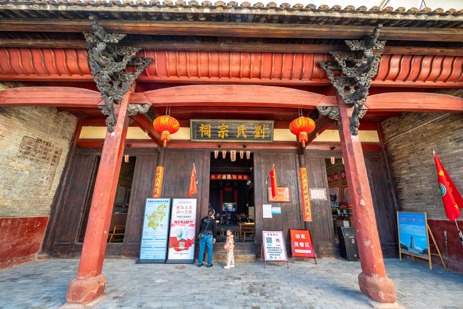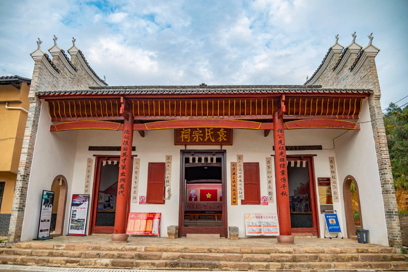 在红军长征小道的终点、登贤县苏维埃政府旧址袁氏宗祠,这里位于于都县祁禄山镇上陵港村袁屋。宗祠里面有放着很多椅子供游客休息,墙上挂满了以前这里关于长征的照片,在这里你可以更进一步的了解当年长征的事。