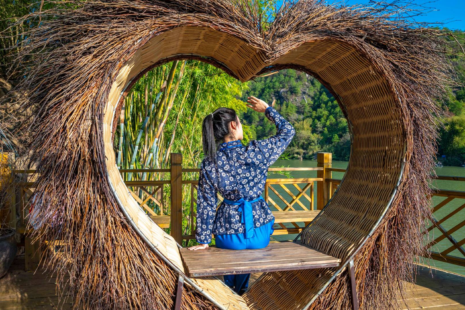 在黄金潭码头,沿着竹林步道一路前行游览,穿梭在碧绿的竹林里,内心一片清爽。还能看到网红爱心座椅,打卡拍照,坐在这里看山看水,非常的惬意。步道的尽头就是观景平台,登上观景台就能远眺这秀丽的山水。