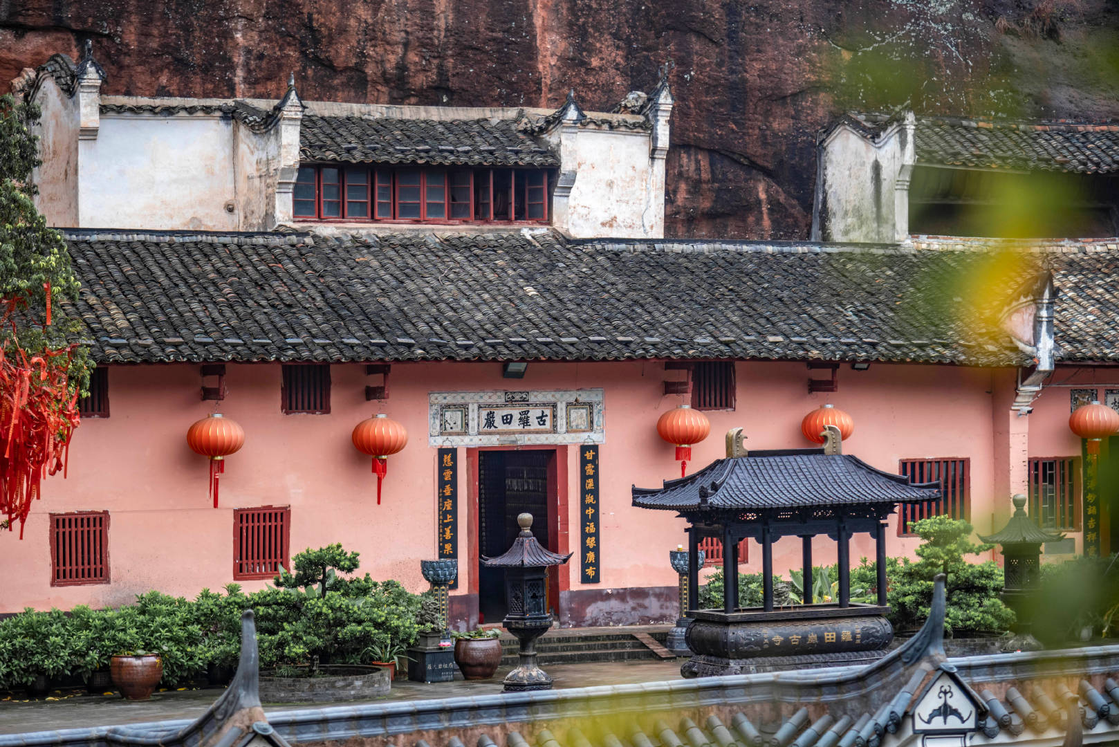 这里山明水秀,风物宜人,四面环山,悬崖屹立。山中寺阁傍岩而设,以洞为室,玲珑别致,自成风趣。