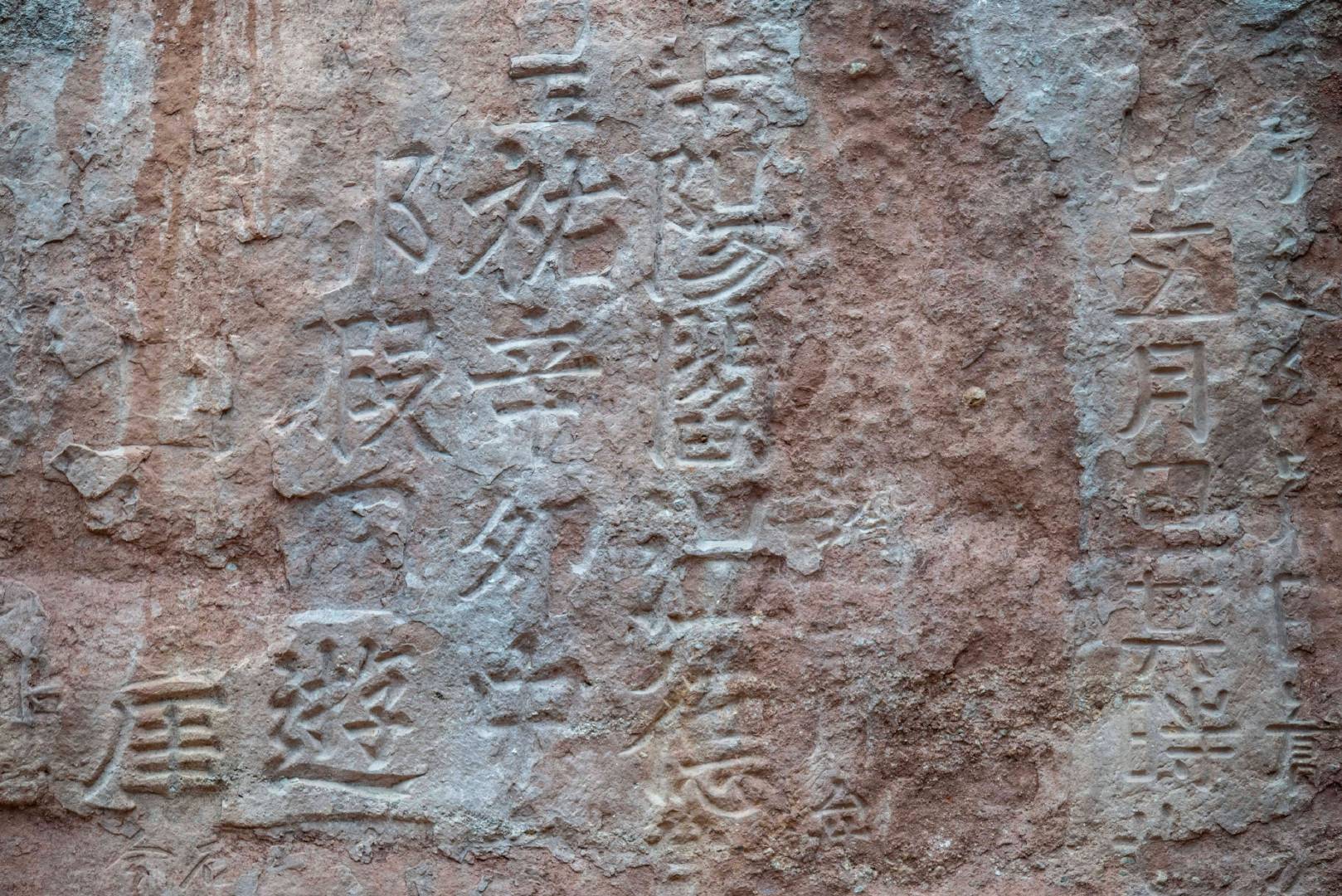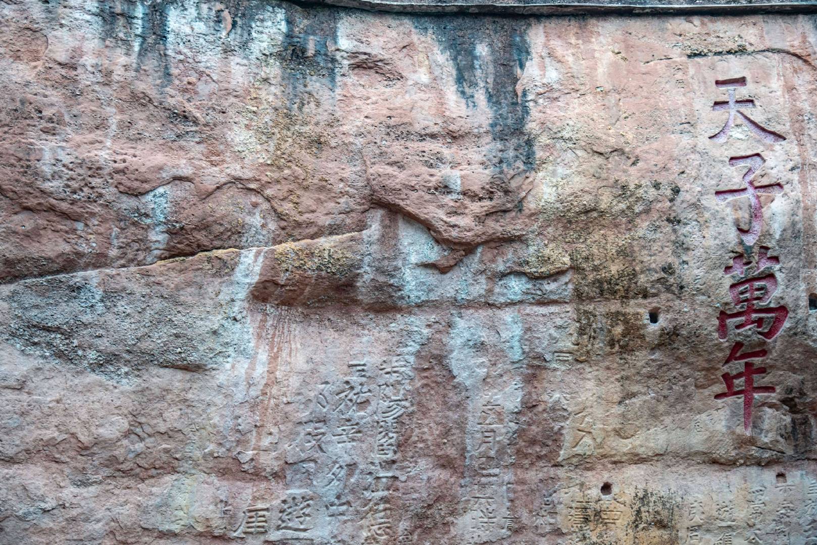 在古寺旁边的悬崖峭壁上,有零星石刻群、岳飞将军的“天子万年”石刻四个大字最为醒目。这里如同一部厚重的历史,从北宋以来的九百多年间,由不同历史人物,在不同的历史时期,用斧凿下了历史的不朽篇章。