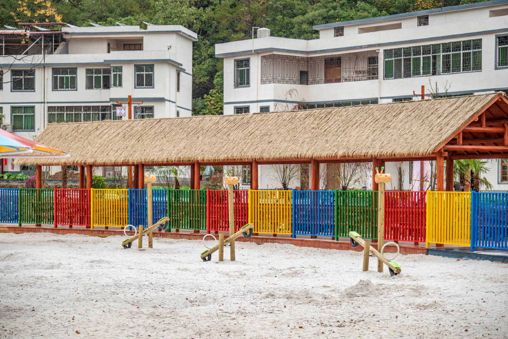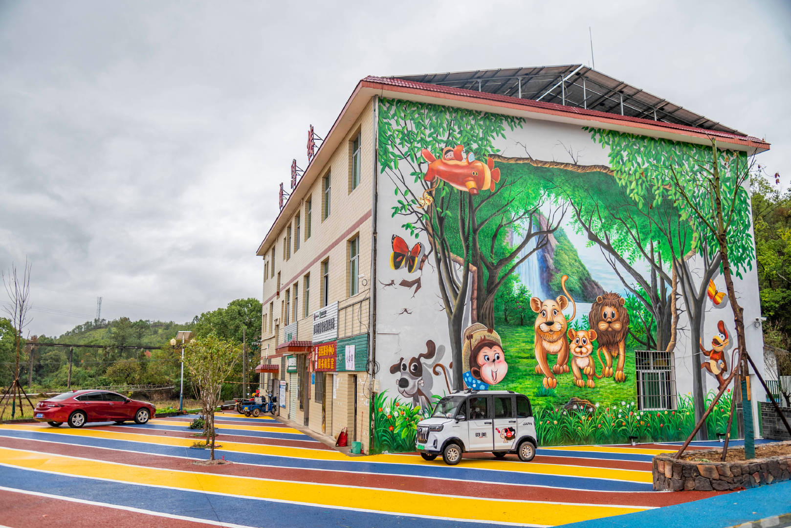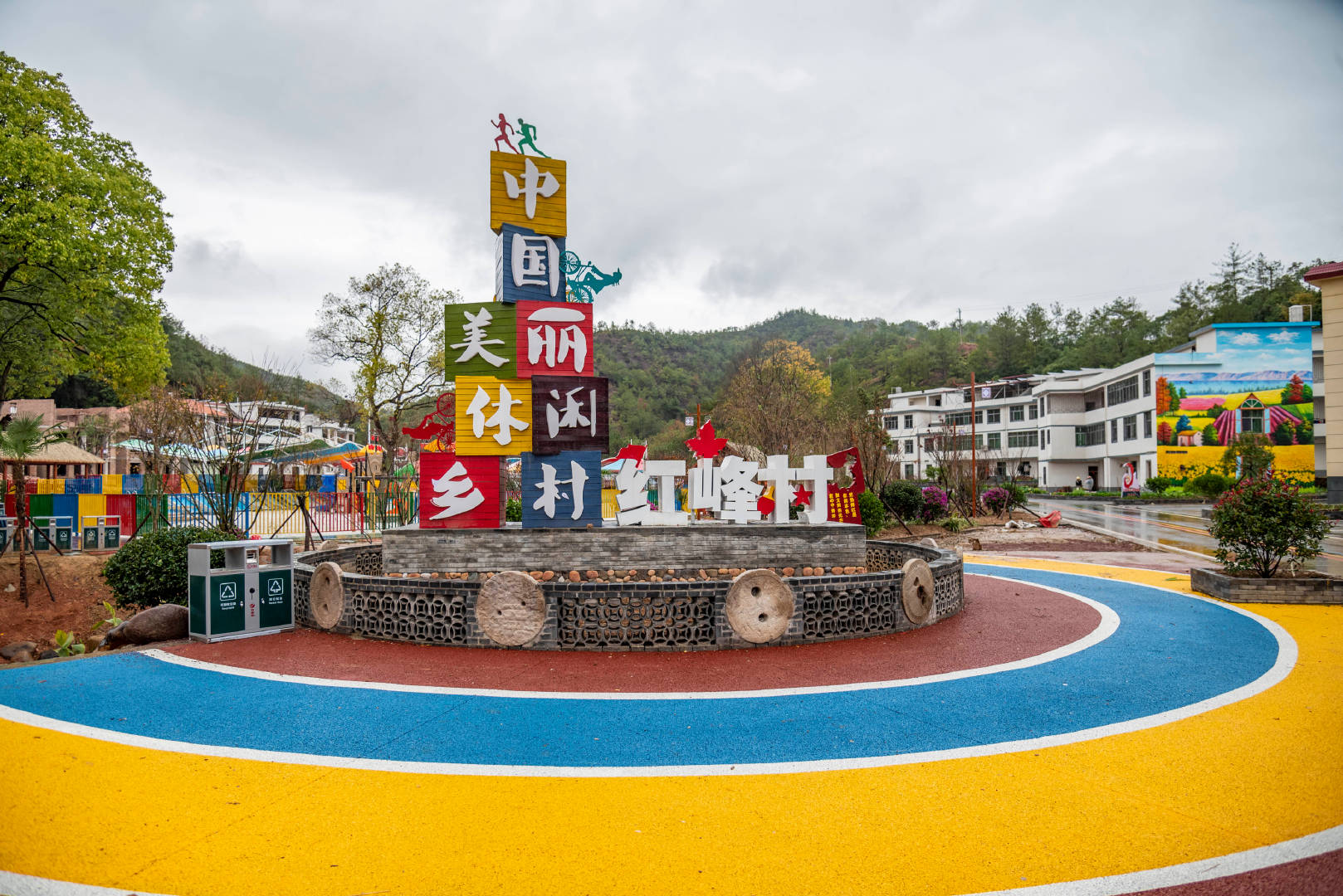 这个五美乡村经过重新翻新让人感觉眼前一亮,每一栋楼的外观都刷了好看的卡通壁画,看上去清新自然,道路很新,有的地方被涂成彩色的样子,村里还有洁白柔软的沙滩,上面还分布着滑梯、秋千、城堡等各类设施,适合孩子们在这里尽情地玩耍,这里空气清新,远离城市的喧闹,多了一份宁静。