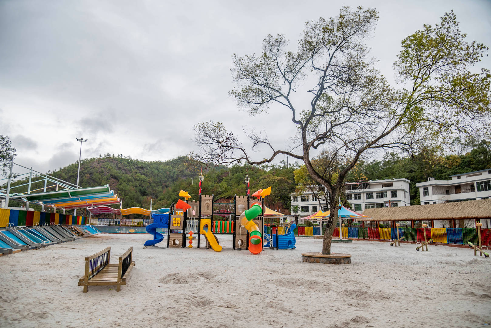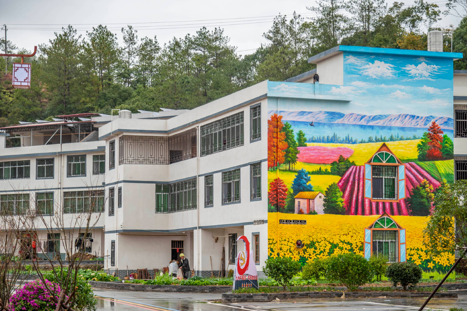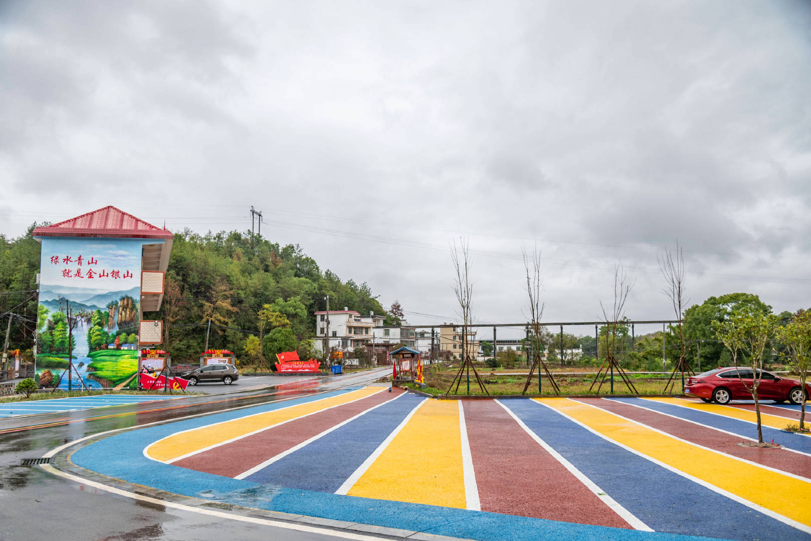 这个五美乡村经过重新翻新让人感觉眼前一亮,每一栋楼的外观都刷了好看的卡通壁画,看上去清新自然,道路很新,有的地方被涂成彩色的样子,村里还有洁白柔软的沙滩,上面还分布着滑梯、秋千、城堡等各类设施,适合孩子们在这里尽情地玩耍,这里空气清新,远离城市的喧闹,多了一份宁静。