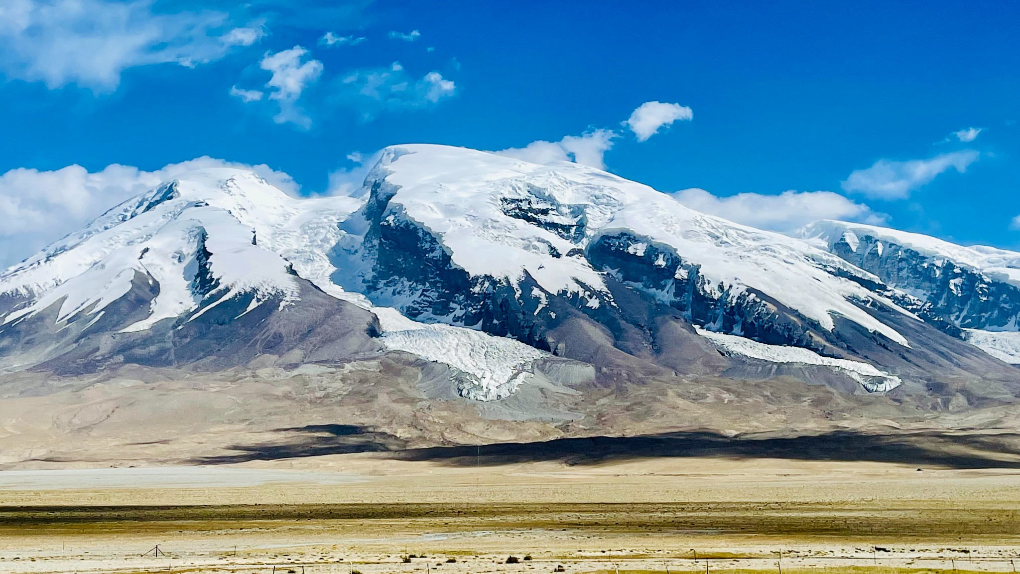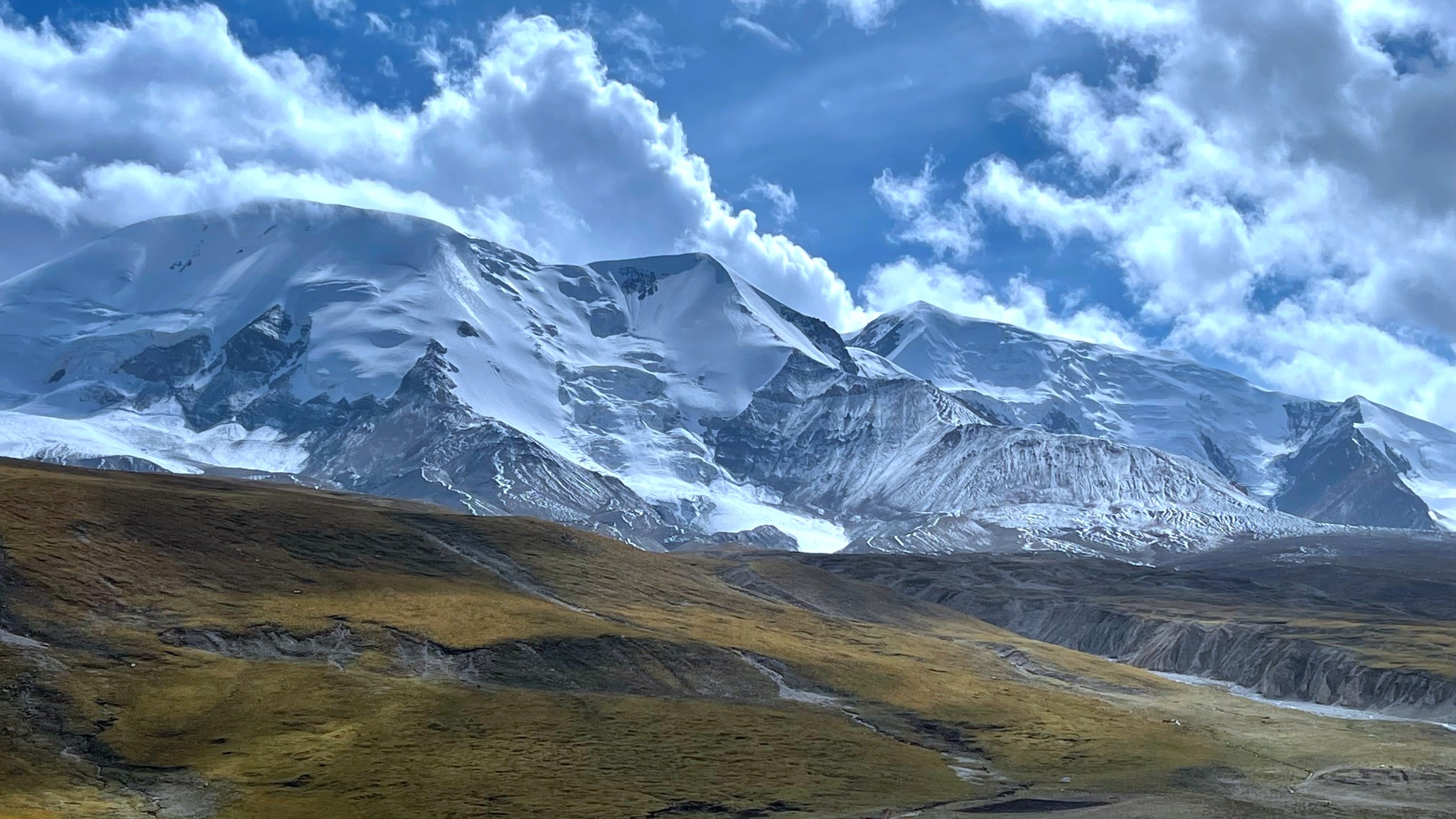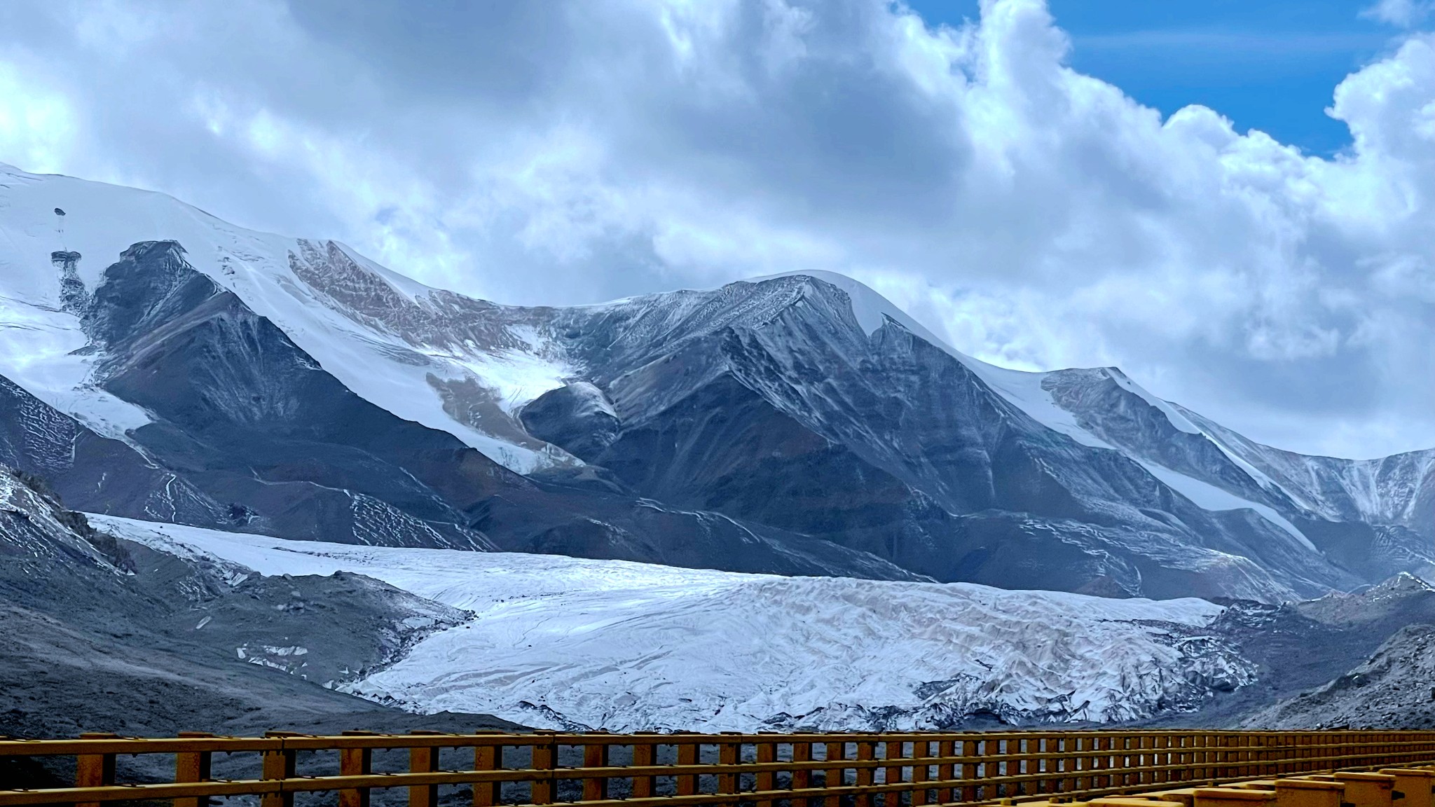 路旁的玛卿岗日雪山,有着清晰的冰舍和冰瀑,雨后的云雾聚集在山顶,近在咫尺非常震撼,艳阳天下竟然遭遇了小规模的冰雹。