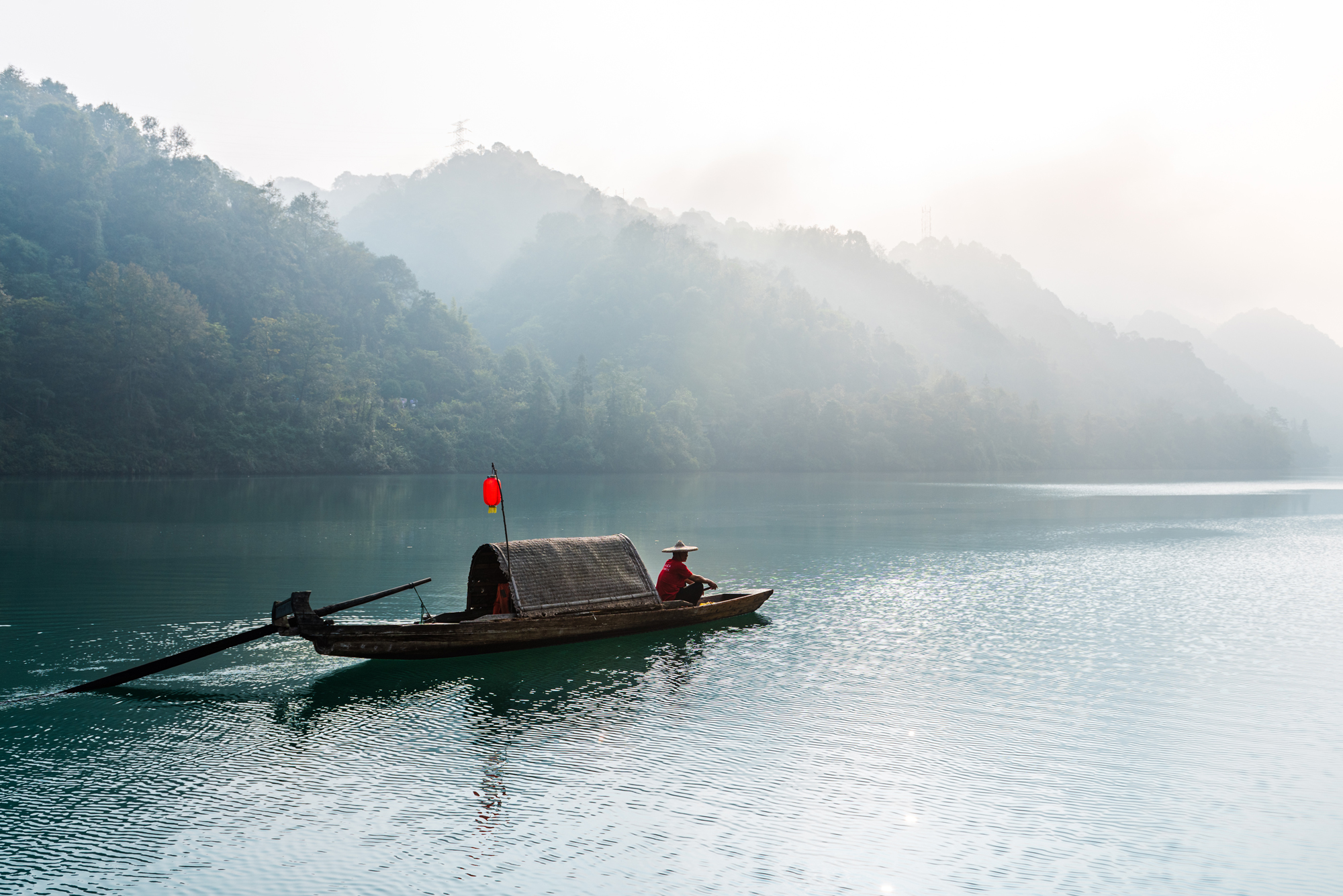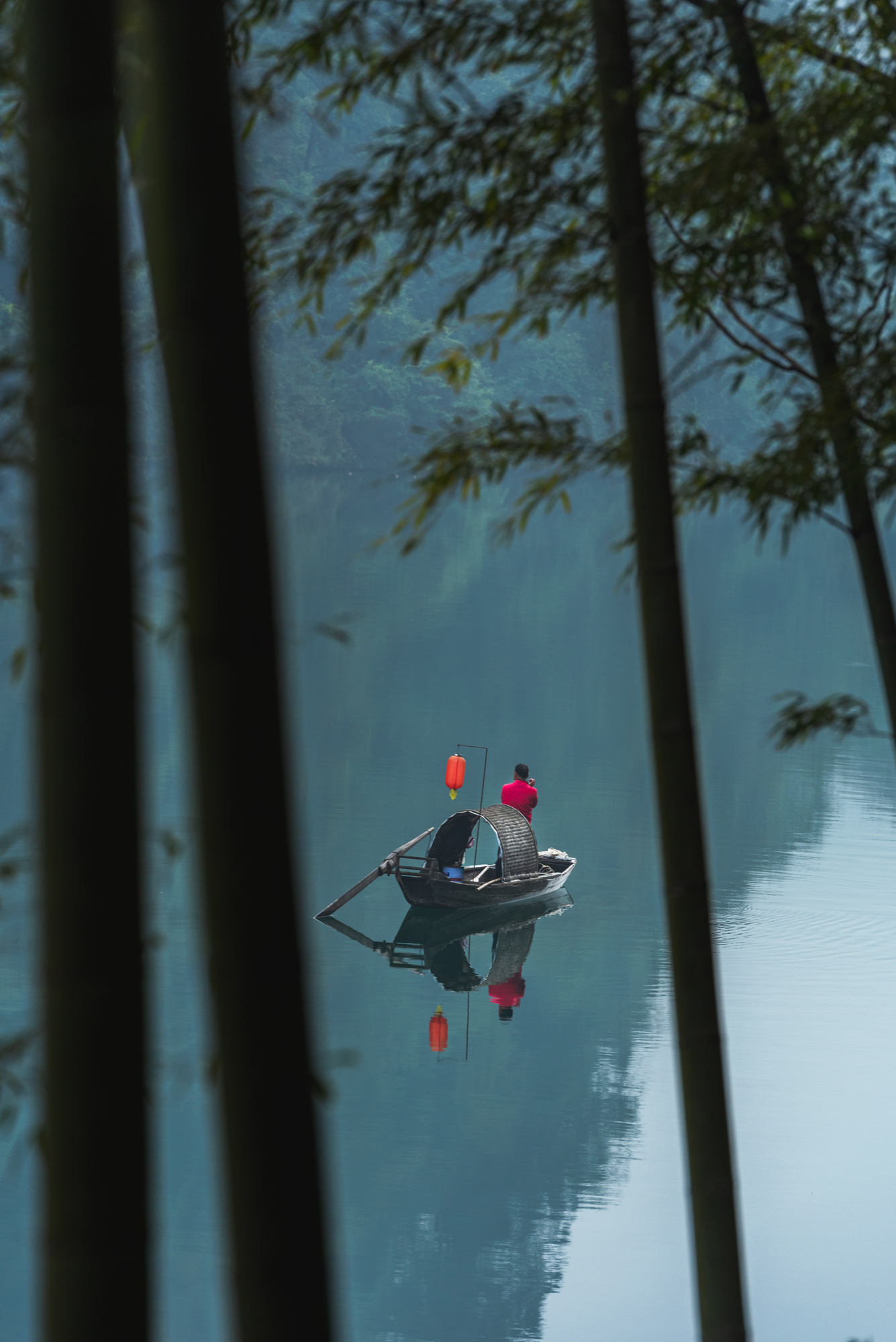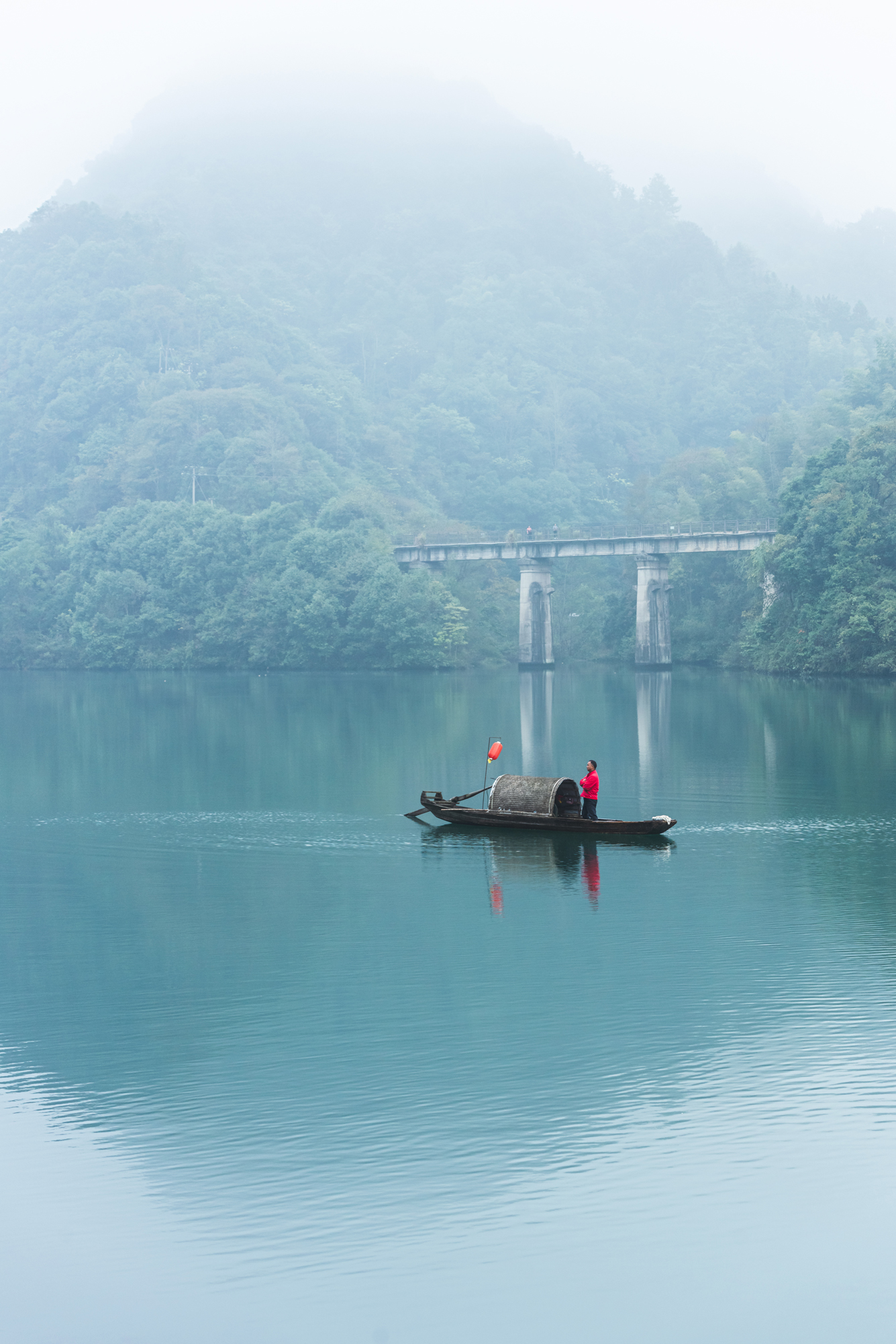 清澈的江水上一叶扁舟,周边环绕着雾气,仿佛在青山绿水间罩上了一层白纱,远山也变得迷蒙蒙一片,眼前浮现出美丽的水墨画卷。
