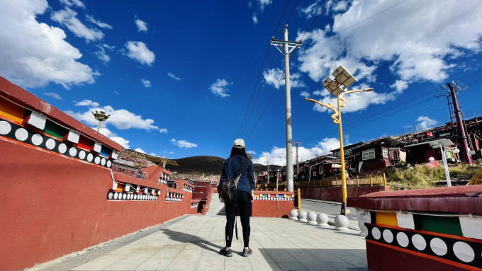 佛学院喇嘛和觉母的区域是分开的,山下一侧都是觉母的住所。下午时间,正赶上佛学院里的喇嘛与觉母下课归来,刚刚进到内部的我,看到大批的穿着红色僧服的觉母们迎面而来,眼前一幕足太过震撼。这里和大学的感觉非常相似,事实上这里也是一所大学,一所佛国的大学。刚入大门是看不见传说中成片的红色房子的,大约向山上走半个小时左右,转过山中间的弯段时,红色的世界才会跃然在你的眼前,如梦如幻。这无数次想来朝拜的圣地,你真的就这样身在其中了,被这修行的世界震撼之余,又不敢去打扰,生怕一不小心吵到了这个世界。