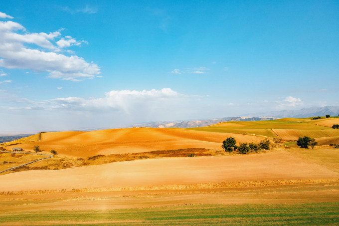 被收割过的麦田显得更加整齐,如同金色的毛毯,平铺在起伏的大地之上。