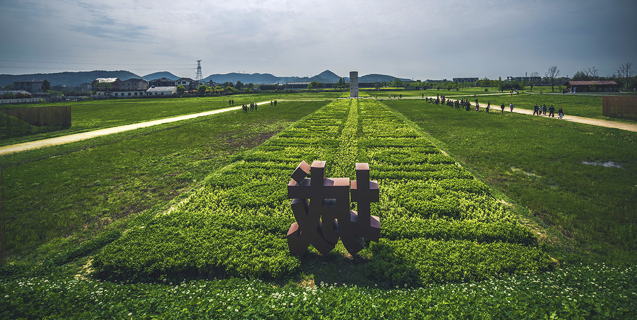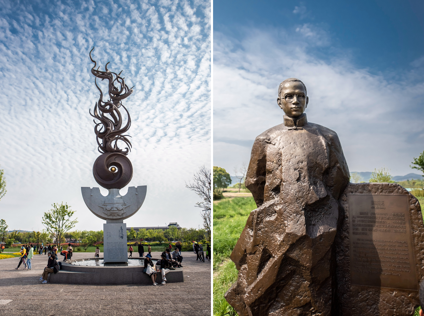 下图左为景区门口的大型雕塑《良渚流晖》,高20米。雕塑由底座、玉器和火焰三部分组成,彰显了良渚古城遗址的精神内涵:底座采用良渚文化标志性器物玉琮的形象;中间的三叉形器,代表人与天地的相互呼应;顶端则跳动着灵动的火焰,象征中华文明生生不息。