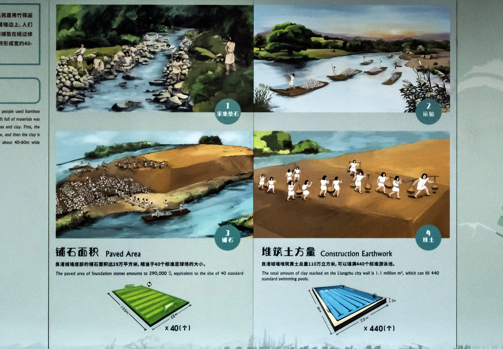 根据考古学家的分析,良渚先民是用竹筏运输建筑材料的,人们先把石块均匀地铺垫在地面,然后把黄土堆筑在石头上,最终形成高约4米的城墙。