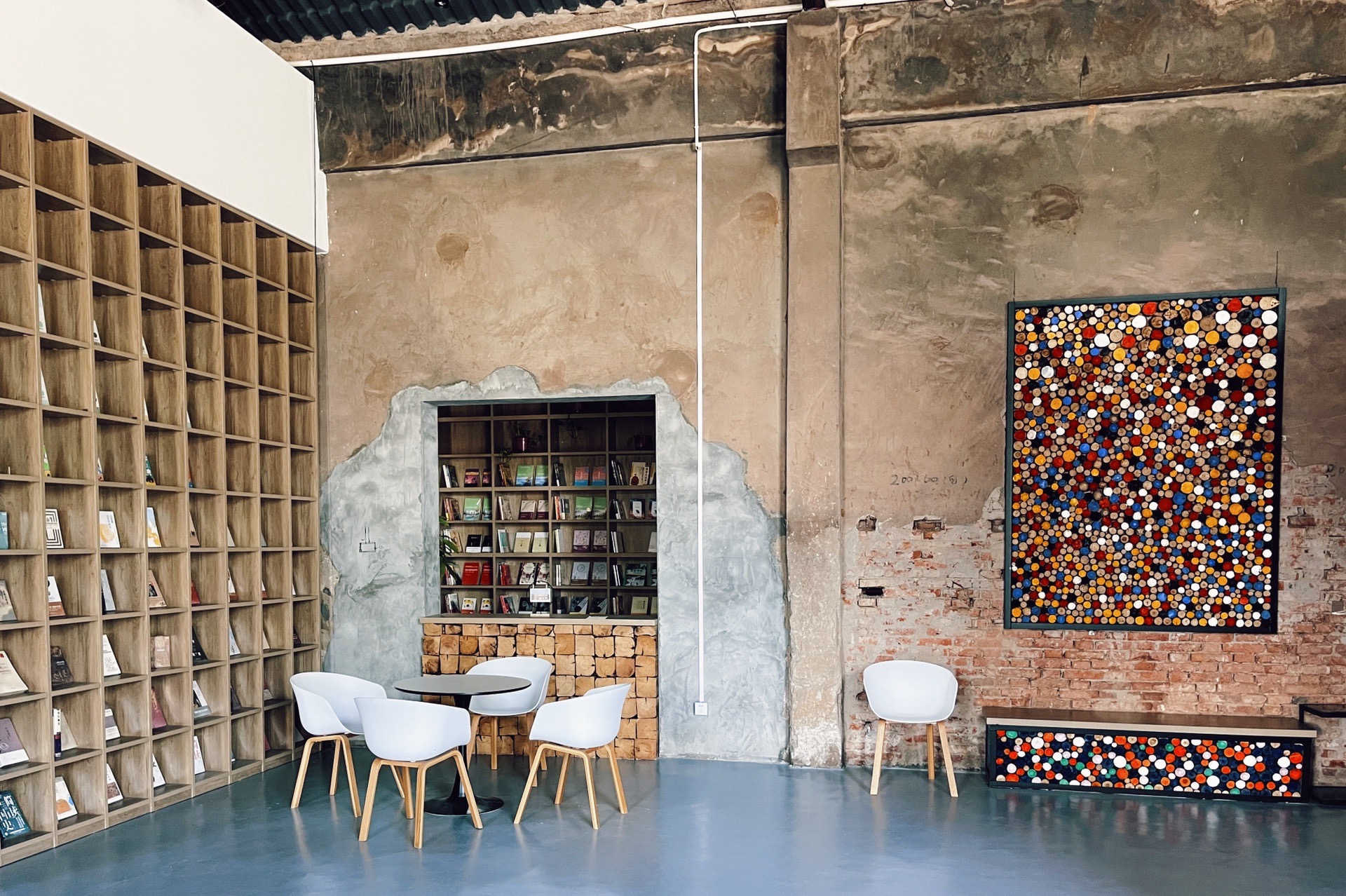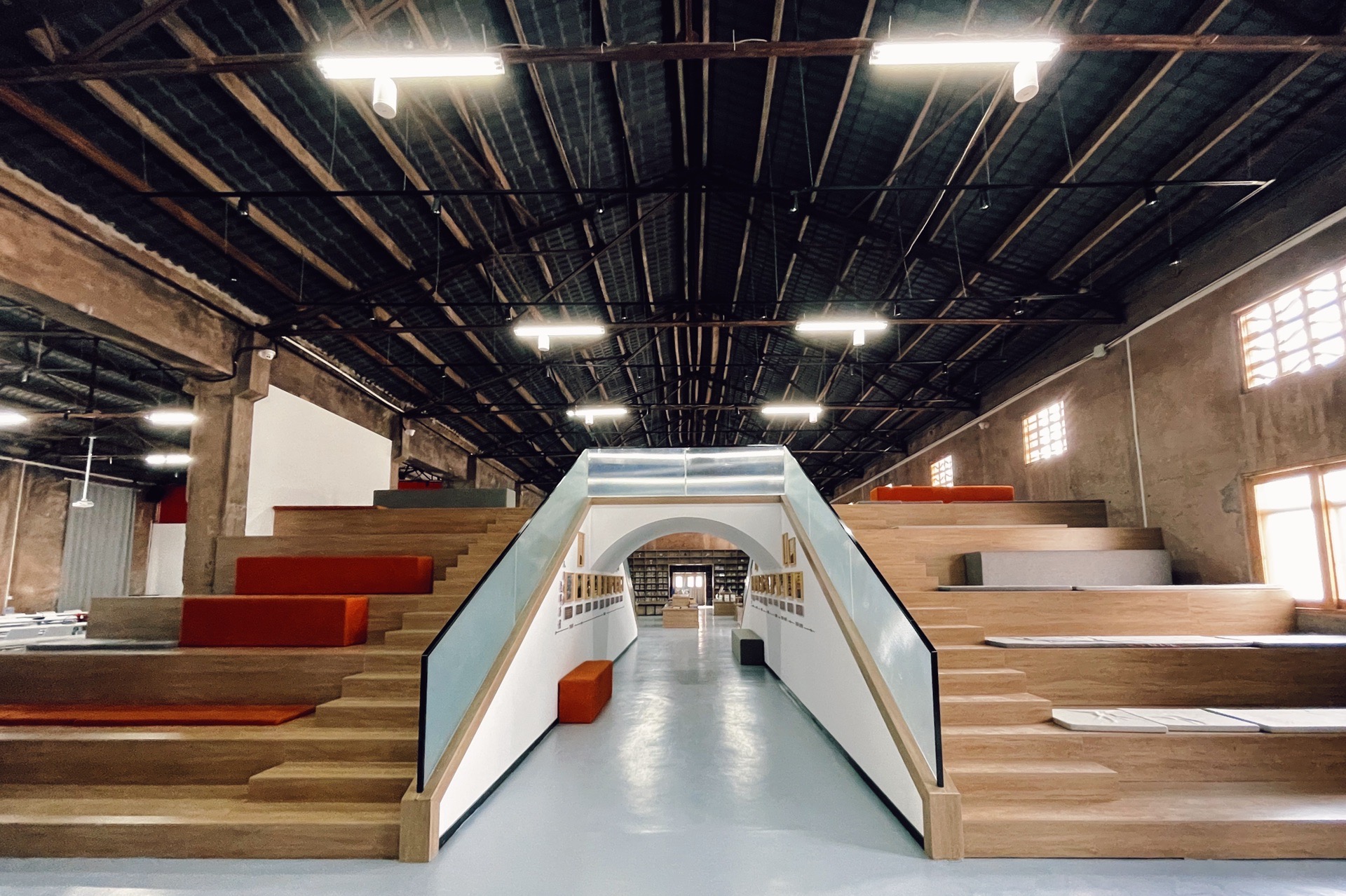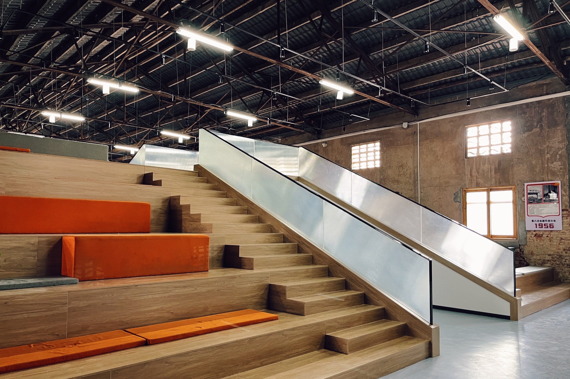 建筑立面被时间侵蚀的痕迹被保留的很好,斑驳发黄的老墙,再度粉饰的工业顶,依旧能察觉出当年的风味。大面积开放式的公共空间被通天的书架,阅读区等,重新分割,只可惜填充的内容让人觉得书籍选品质量不高,更像一个红色秀场。我笑了笑,对身边的朱老师耳语到:“太红色的氛围,让自由精神无处安放。”