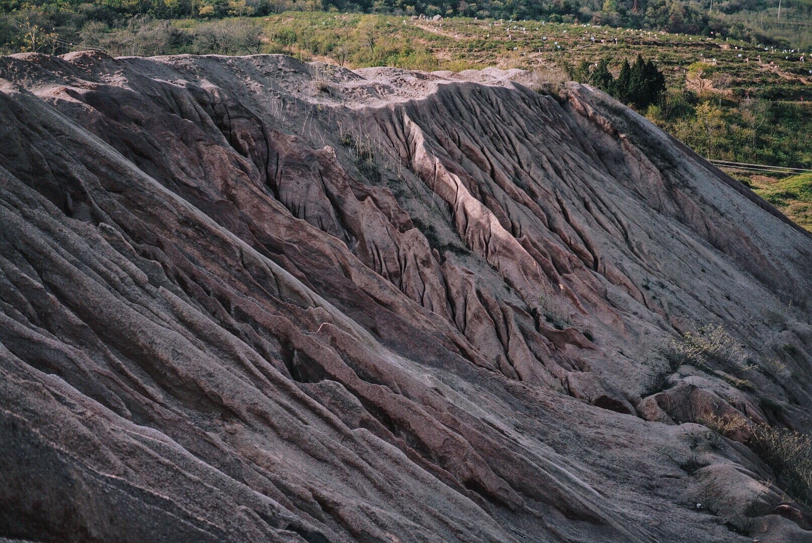 远观这山,海拔不高,秃顶平头。土红为基色,沟壑纵横且不生草木,似乎有着不一般的气质,但与其吹嘘形容为丹霞地貌不如描述成土丘更为贴切。