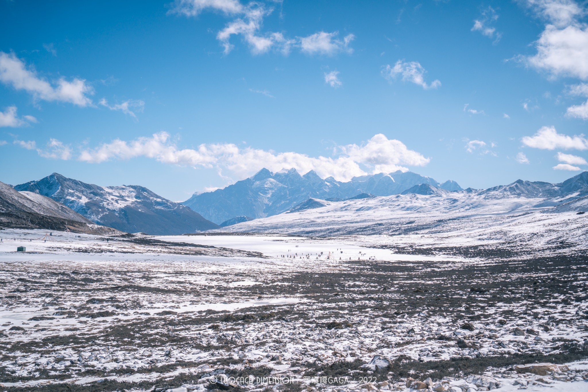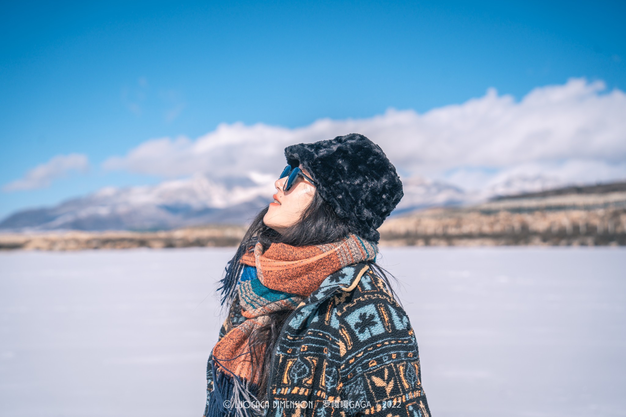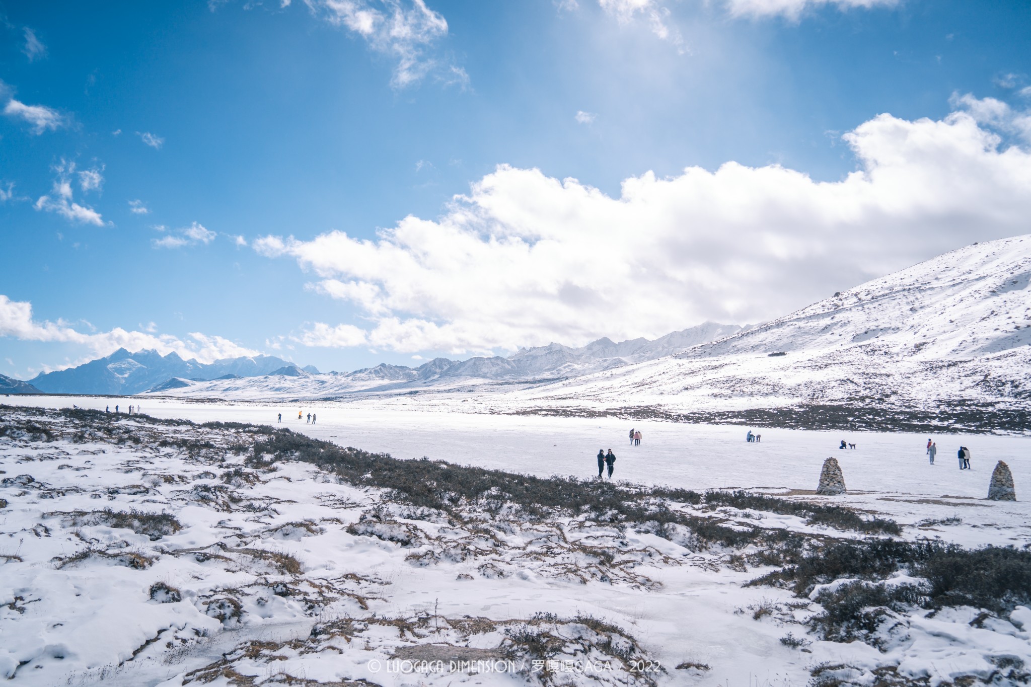 冬天的川西,雪山更白了,湖泊都结了冰,但也不是单一的纯白,白色和大地色系轮番登场,搭配经幡的五彩和天空的蓝,更添圣洁之感;
