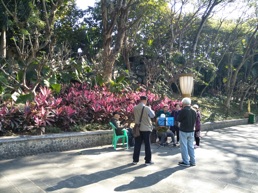 ,这里每天早晨都有不少老年人在演奏(萨克斯、二胡、吉他、风琴、口琴、唢呐……)、跳舞(T台秀)和练太极等。