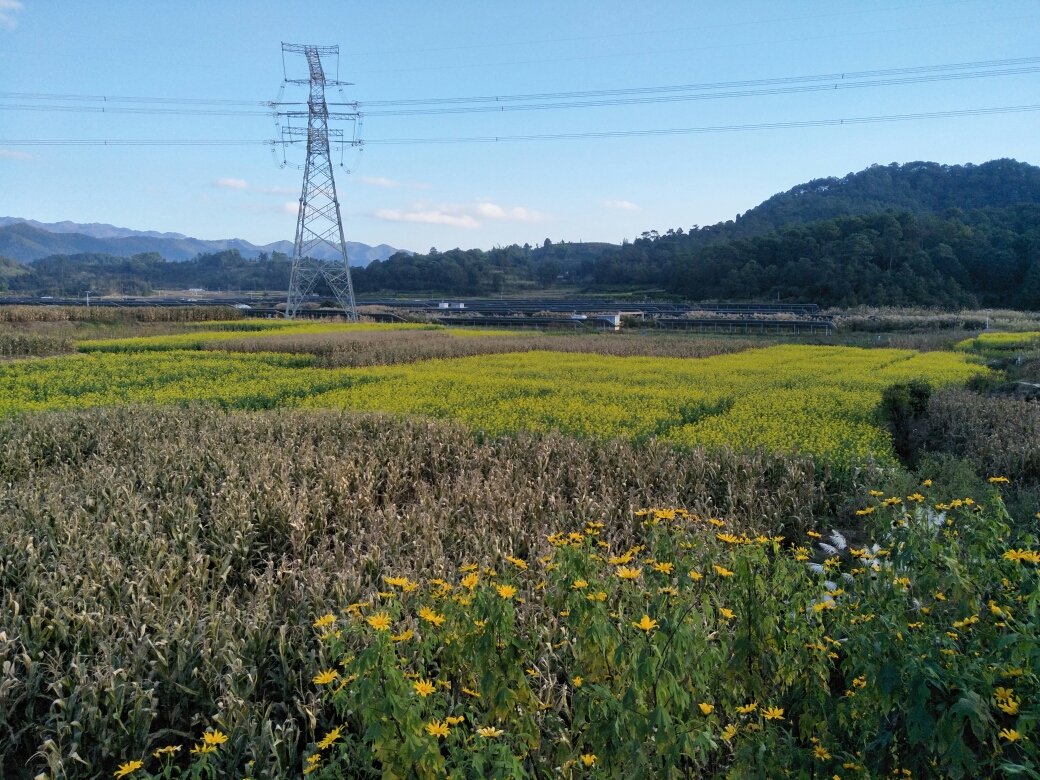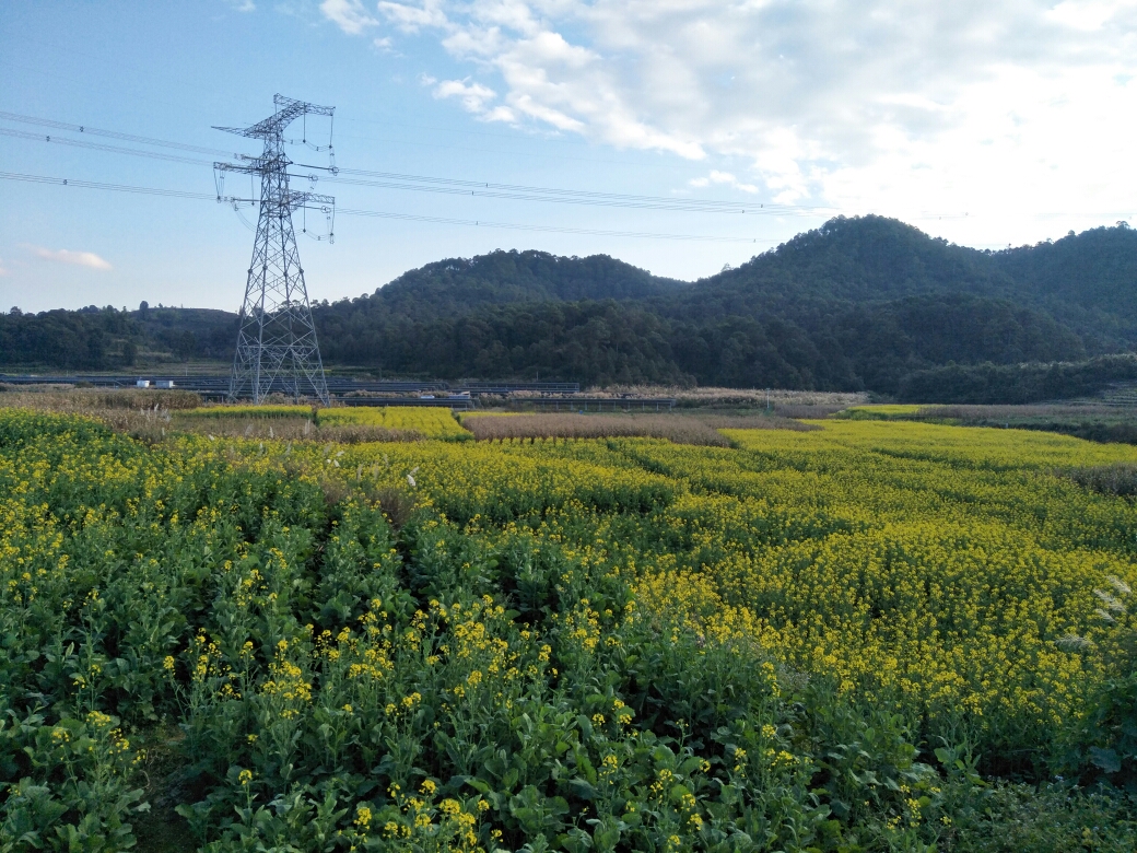 从昆明走国道前往西双版纳傣族自治州,途径因远镇,在中广核光伏发电站附近,竟然还能看到大片大片的油菜花(也可能是其他菜花,没有仔细研究
