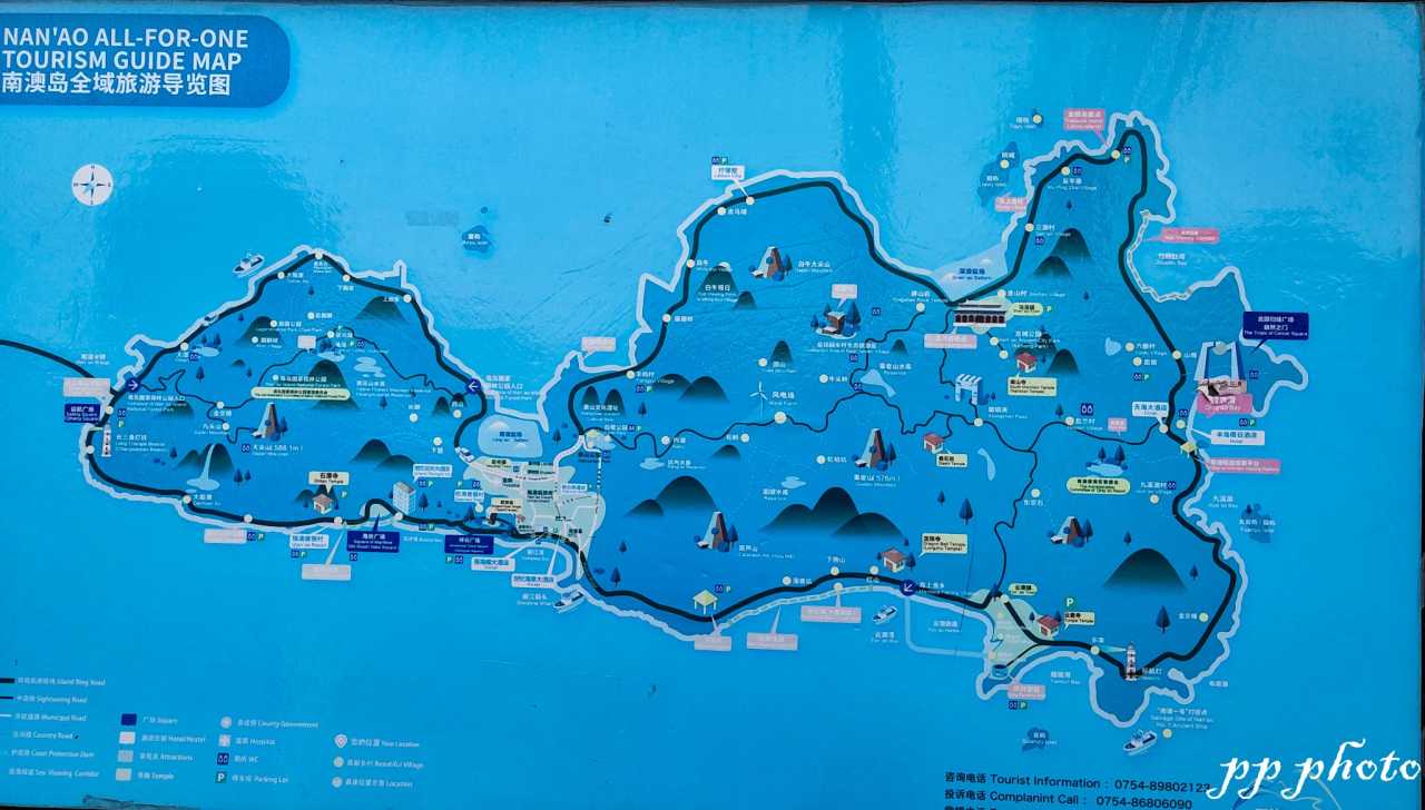 南澳岛环岛接近70公里,住二晚,玩了前后三天。过海大桥只允许小车通过(听说95元来回),自行车和摩托车只能坐船(50元来回)。