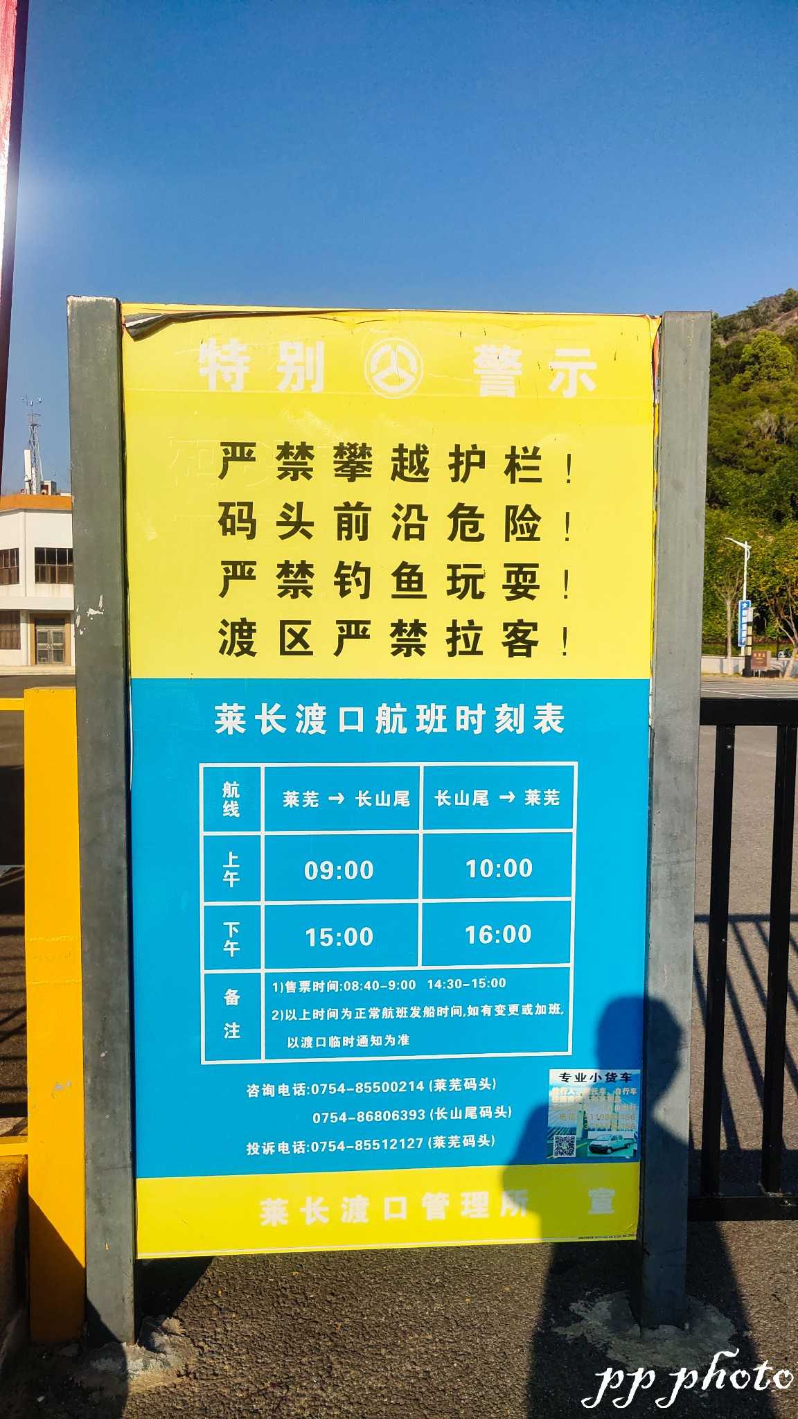 摩托只能坐船过海,导航莱长码头,每天只有二班船,早上9点和下午3点,双程票50元含人,回程要验票,请保管好票。返回长山尾码头是早上10点和下午四点。