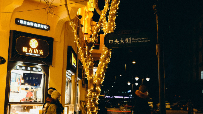 在2021年的最后一晚来到这儿,沿街的树条上挂着晶莹,在不断变幻的灯光照耀下,都让人流连忘返。马迭尔冰棍是一定要吃的,店门前早已排起了长队,我们买了一只5元原味,说真的,味道很一般,只是调制的奶香味而已,吃到一半就放弃了,实在接受不了体外+体内的双重严寒考验。
