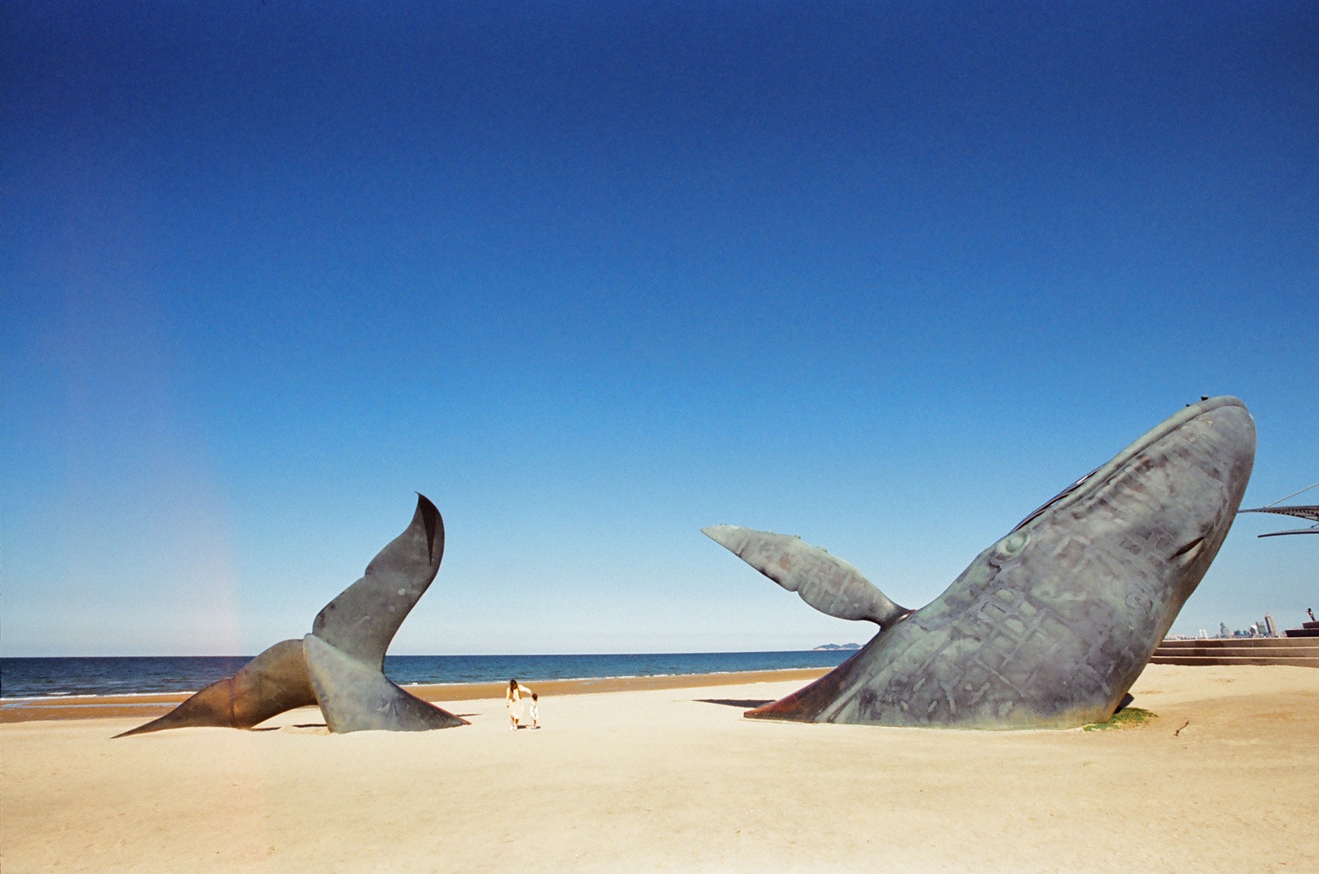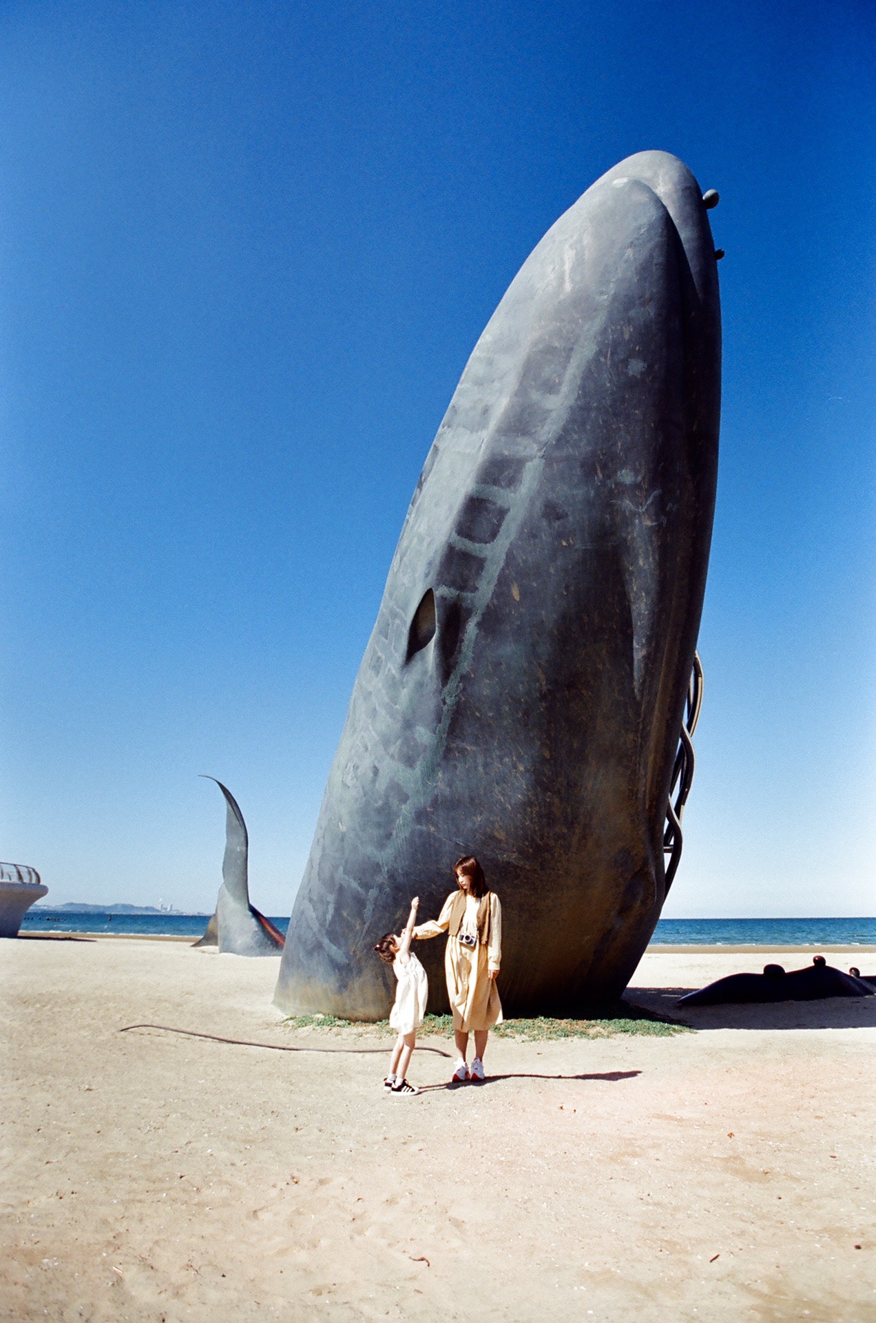 这个雕塑对于很多来烟台做攻略的朋友应该都有看过,或者有印象,其实雕塑本身是一个滑梯,自身的颜色也是灰色为主,加上金属的质地,看起来灰突突地,远没有网图那么地绚丽迷人,其实这种颜色和质感我感觉更加贴合鲸鱼真实的表皮质感,其实我在胶片送去冲扫的时候选的是诺日士扫描,但是店家大概率扫的是富士3000,色彩艳丽,饱和度高,由于不是经常冲洗的店铺,我也没有再去追究店家了,这个在最后说说