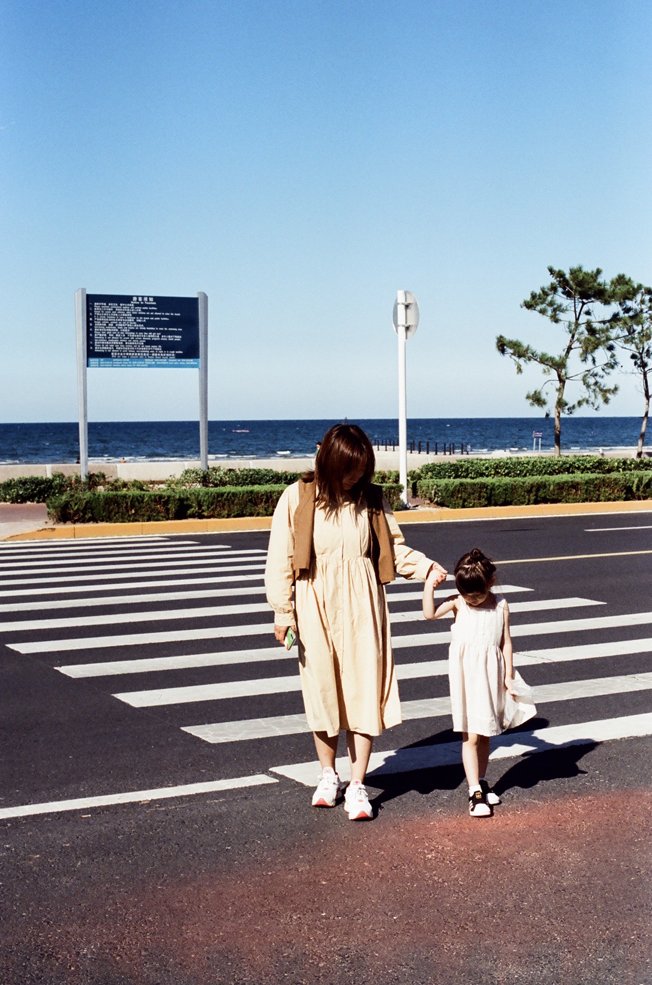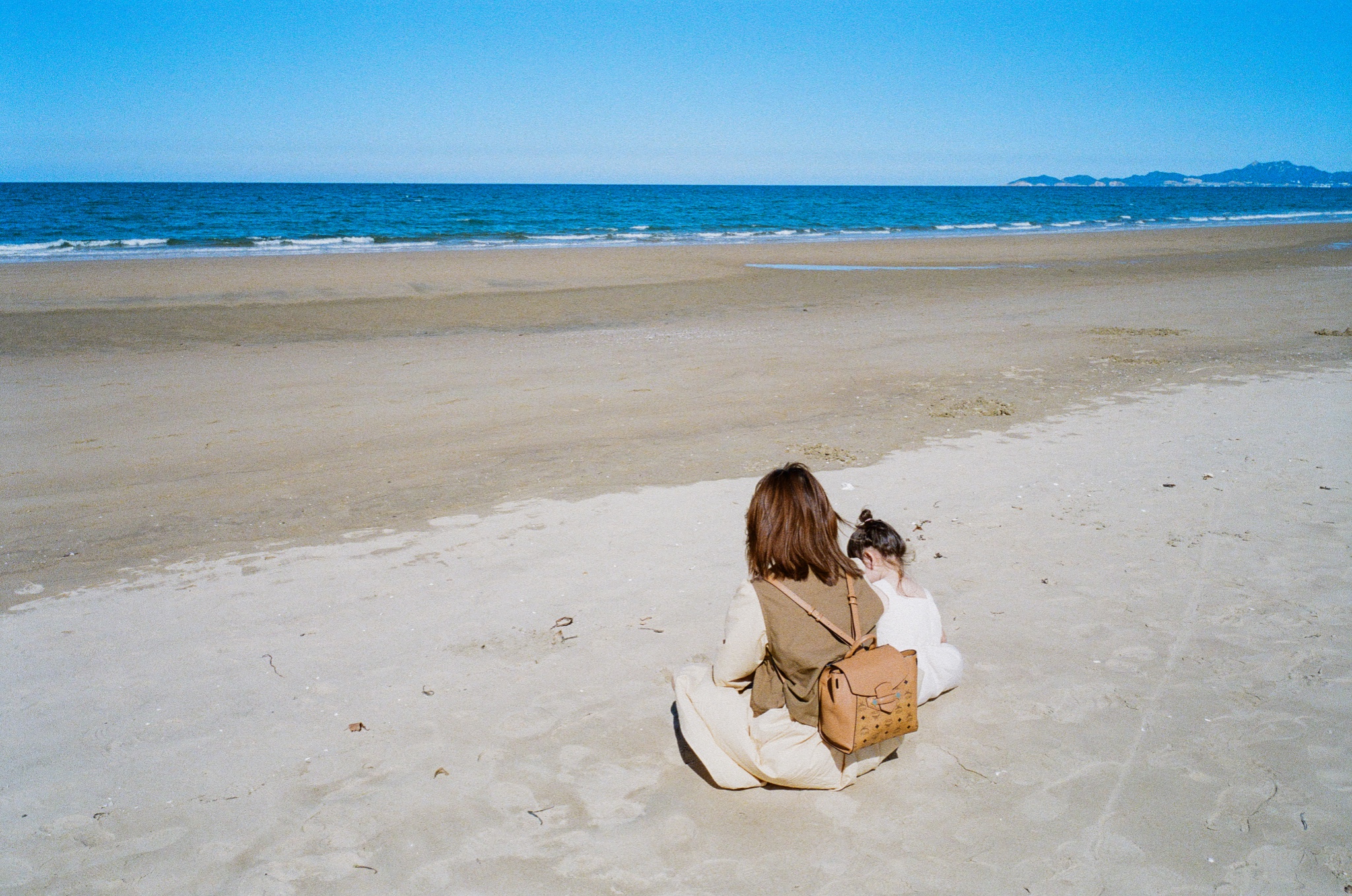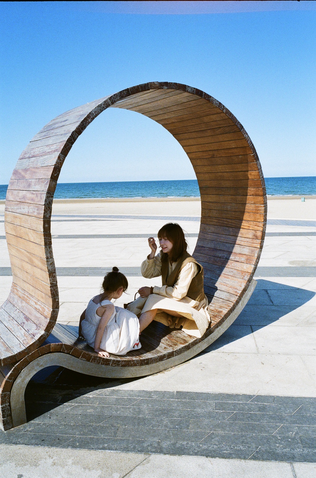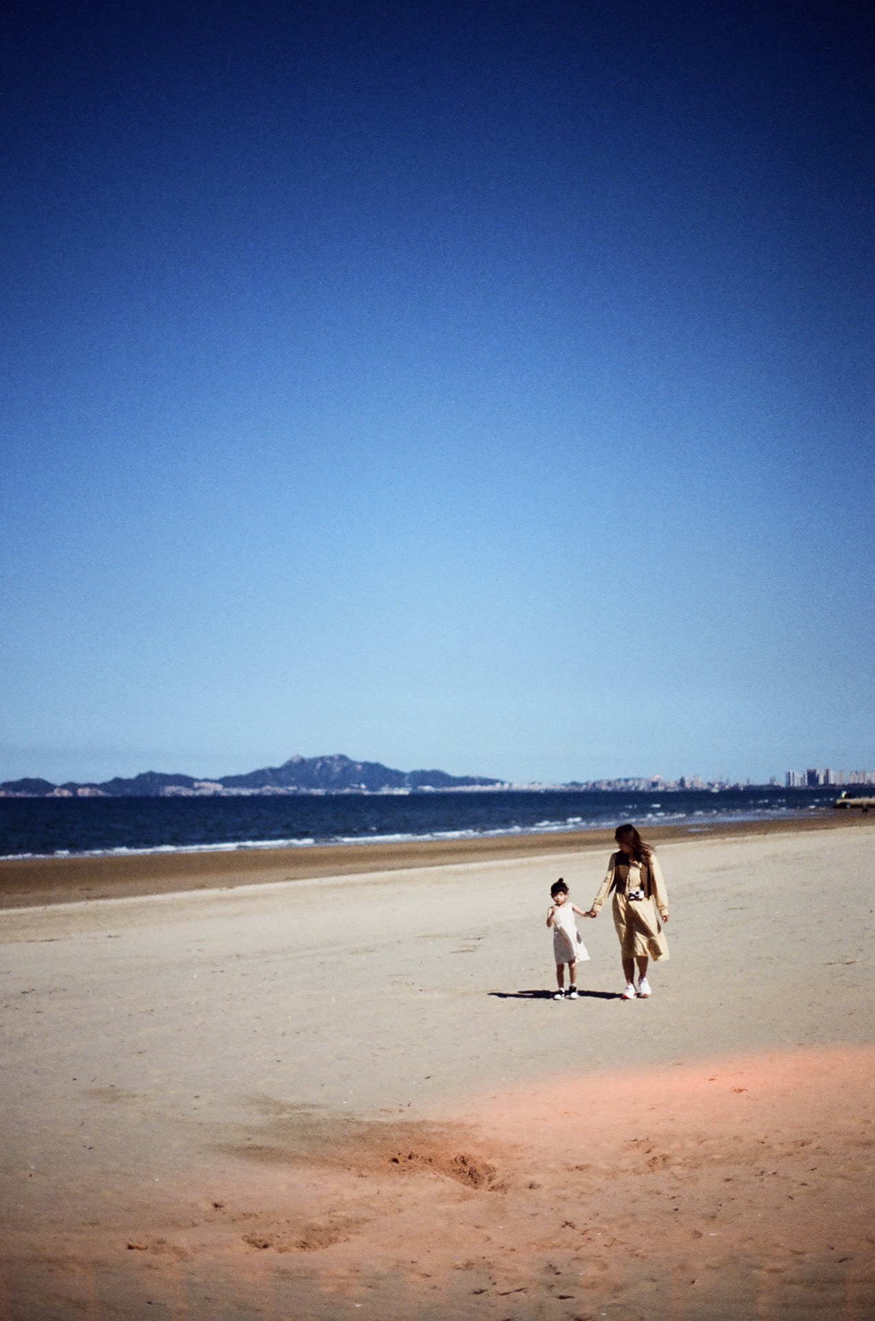 孩子在按下快门的瞬间还在向母亲展示着刚拣到的贝壳,可媳妇早就见怪不怪了,可能这就是成年人和孩童在得到物质时的区别吧。