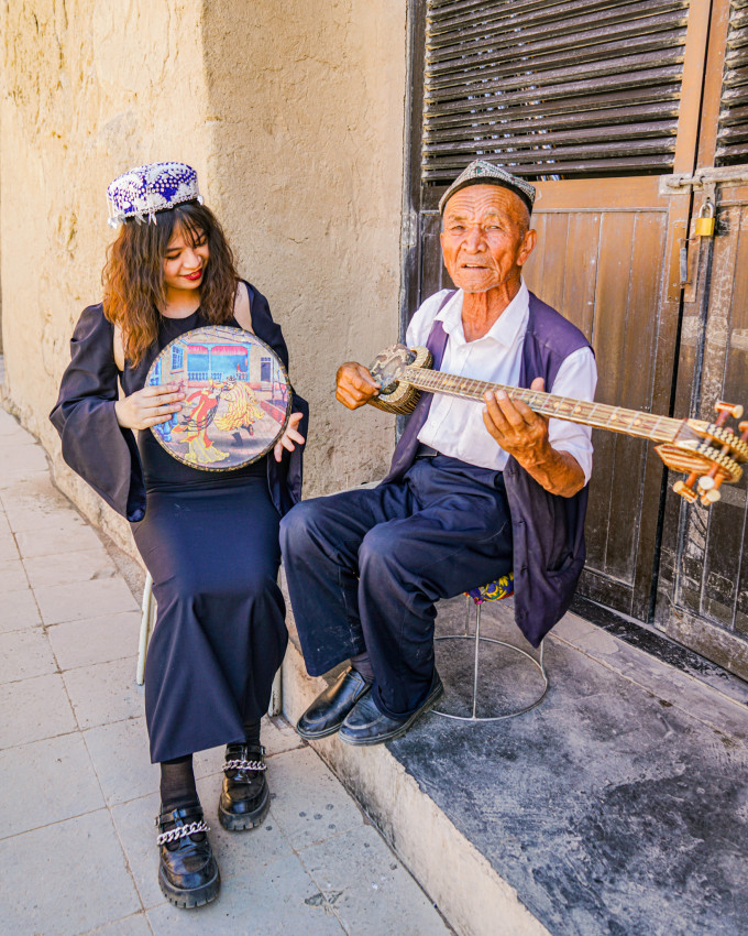 爷爷真的太过热情,非要我坐下陪同他high。不仅教我怎么打手鼓(虽然我还是打得乱七八糟)还将新疆帽一把扣到我头上,现在回顾才发现,这竟是我唯一一次在新疆带起新疆独有的新疆帽。