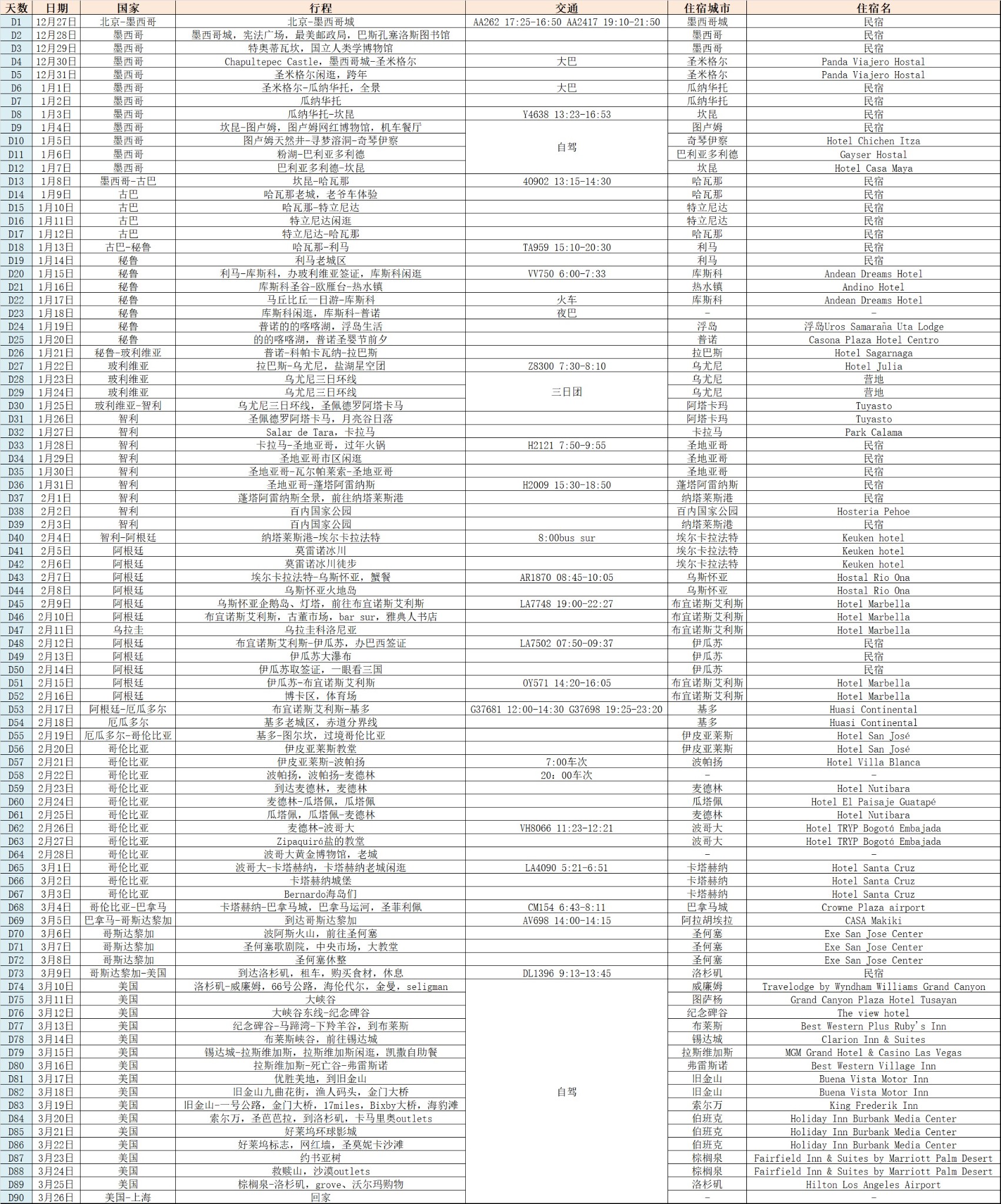 因为行程过长,所以用表格整理了下,交通和酒店名也都在图里了~