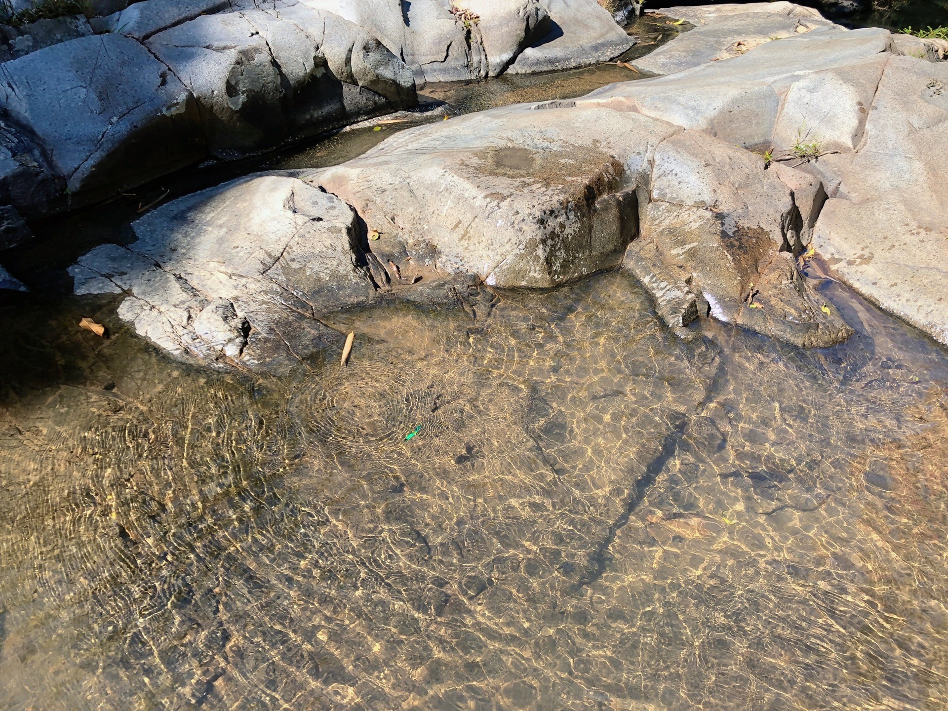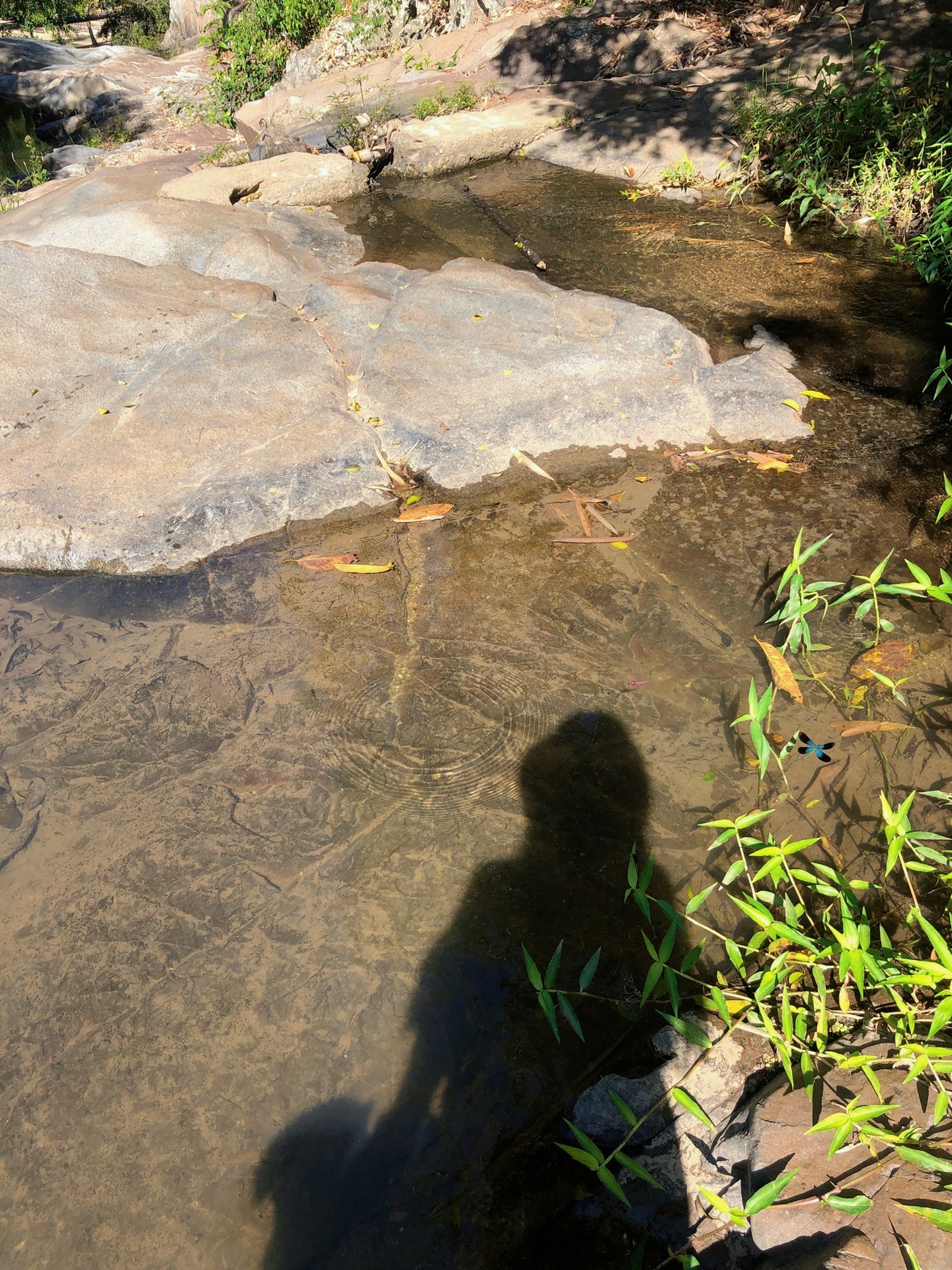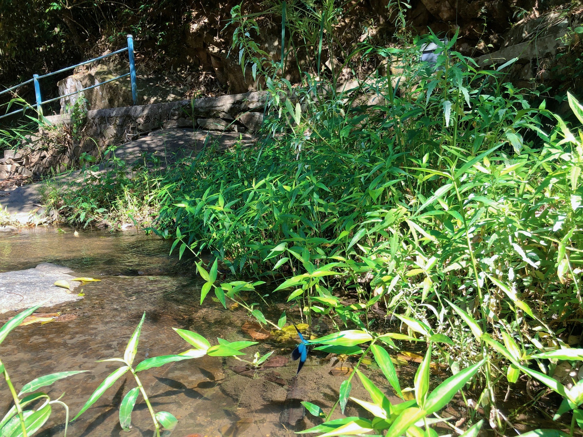 一只翠绿色的蜻蜓飞过清澈见底的水潭,还来不及追逐,便又发现了另一只蓝色的蜻蜓停在水潭边的草叶上,它们那高饱和度的色彩让我感到新奇不已。