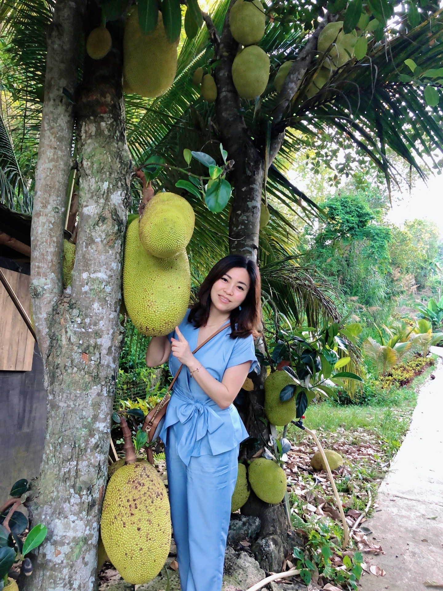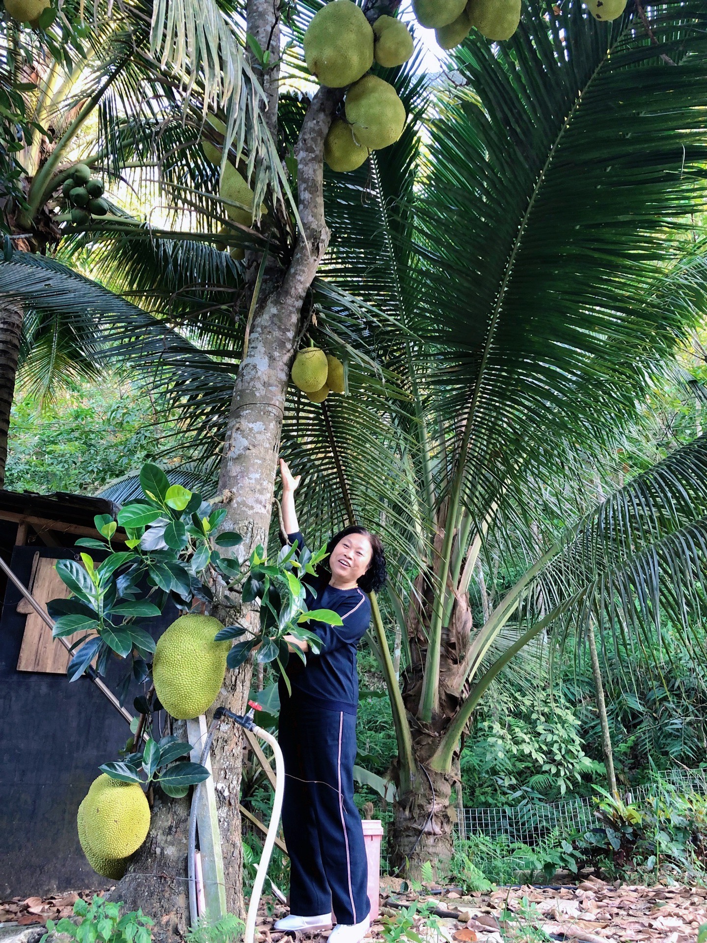 一进山庄大门,便看见一棵高大的菠萝蜜树,我和妈妈兴奋地下车拍起照来。