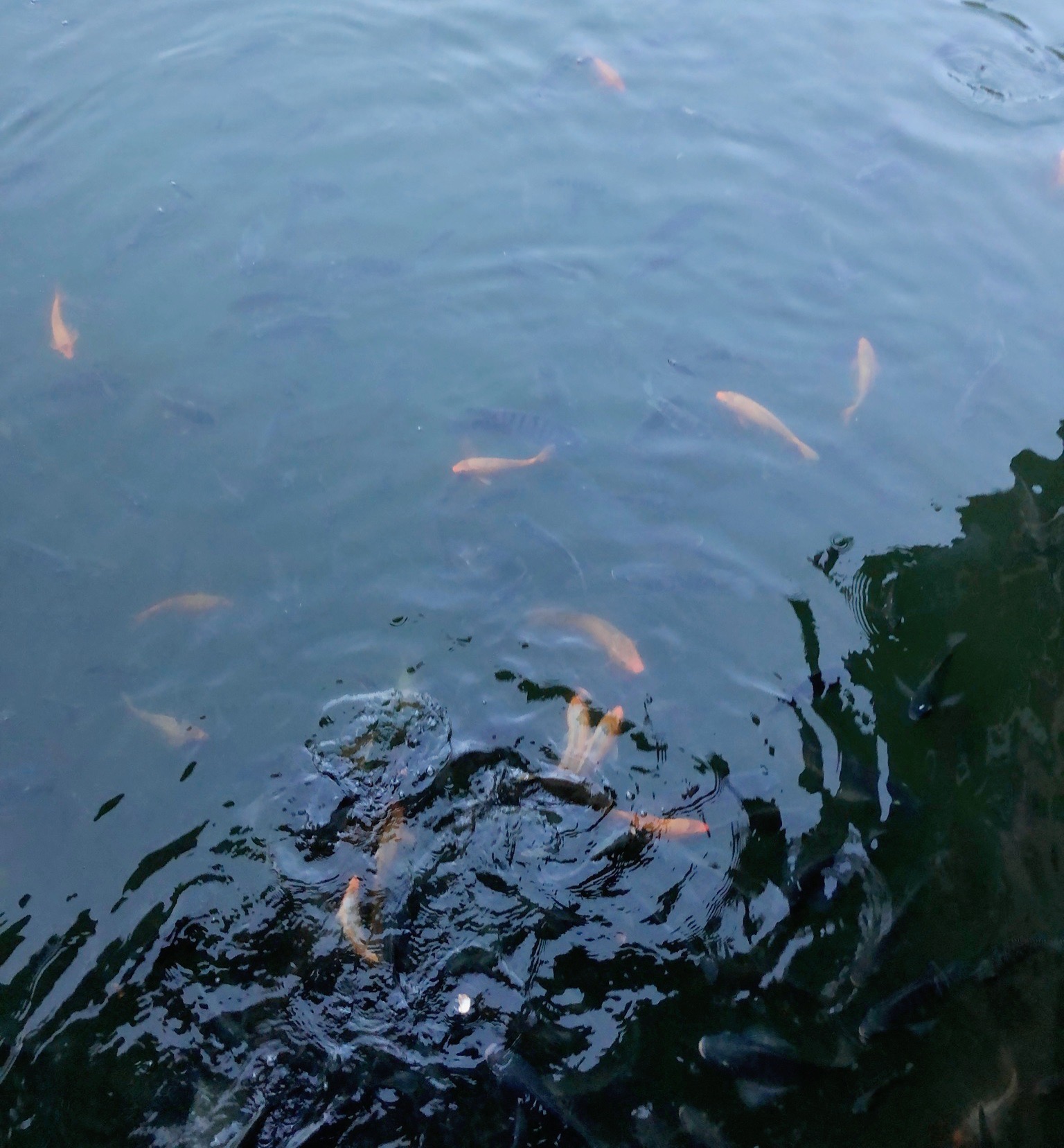 亭子下面是鱼塘,里面的鱼密密麻麻。