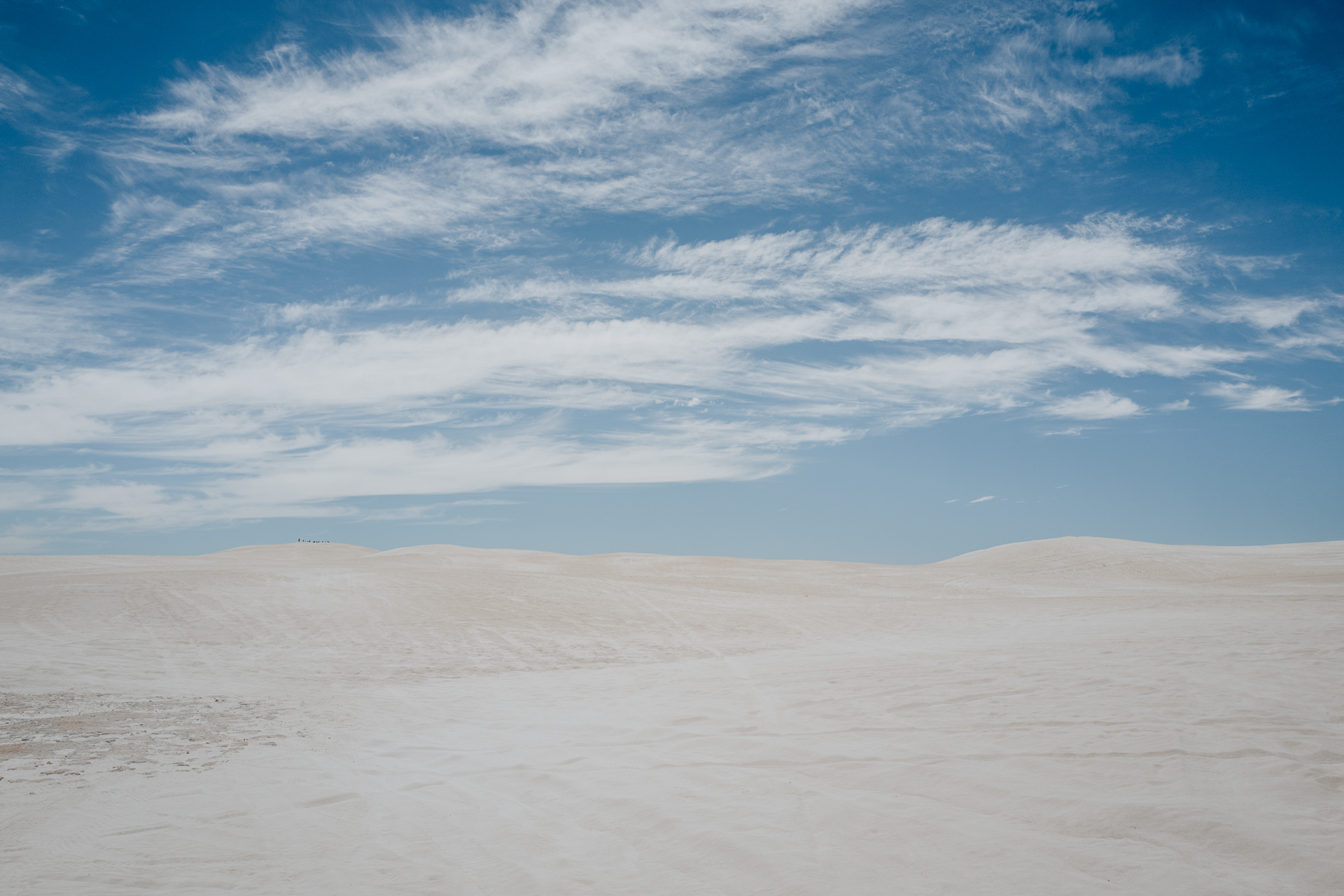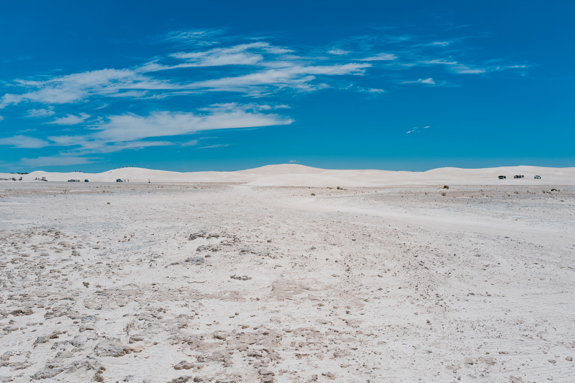 话说兰斯林山丘在西澳自驾游的线路上也算是大名鼎鼎的一处“景点”了,可这地方看上去没有一点景点的架子,跟着导航拐进小路,我们一度以为是导航错了,没想到小路走到尽头路边的绿植突然就全部消失了,出现在前方的是一片白色的沙漠海洋。