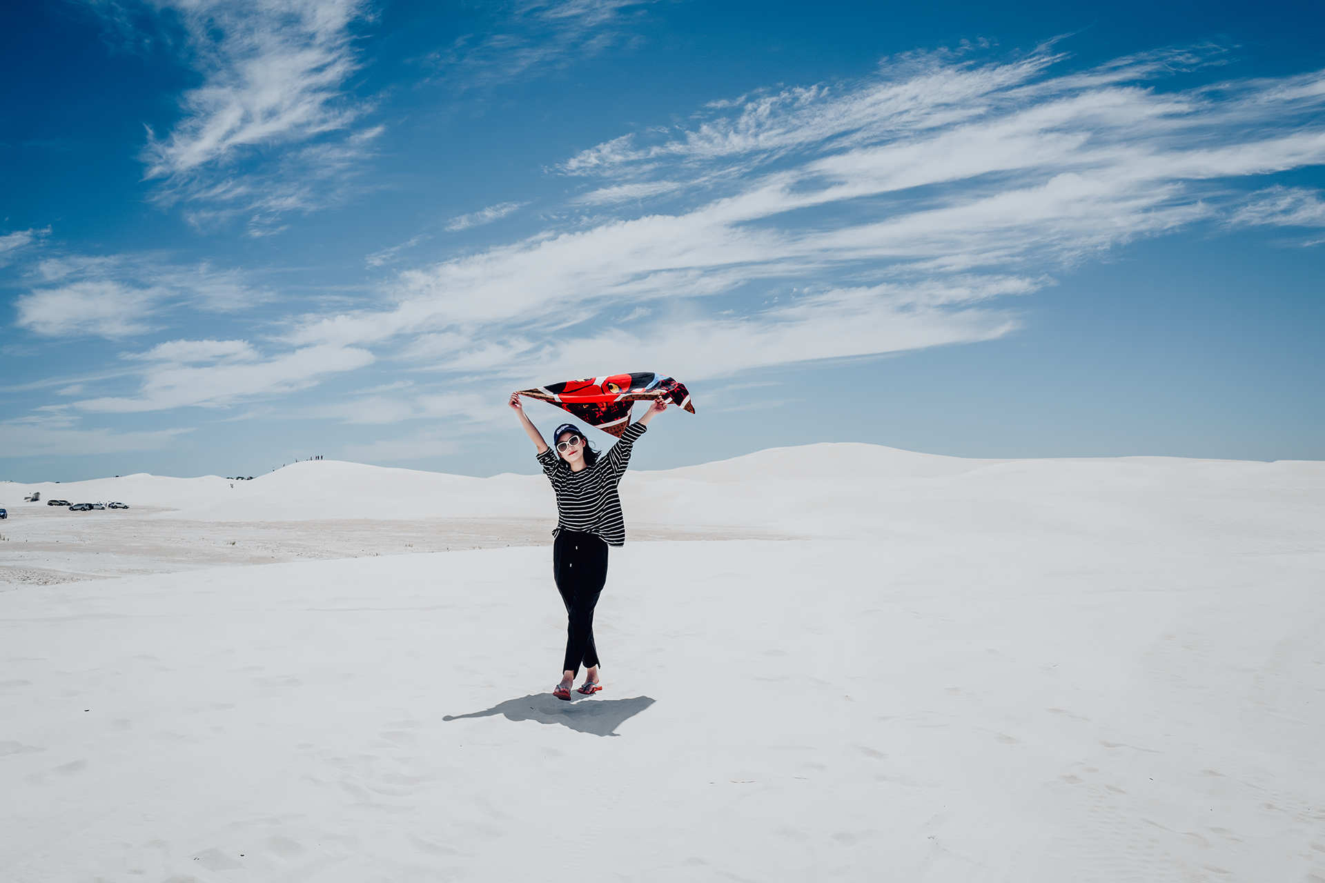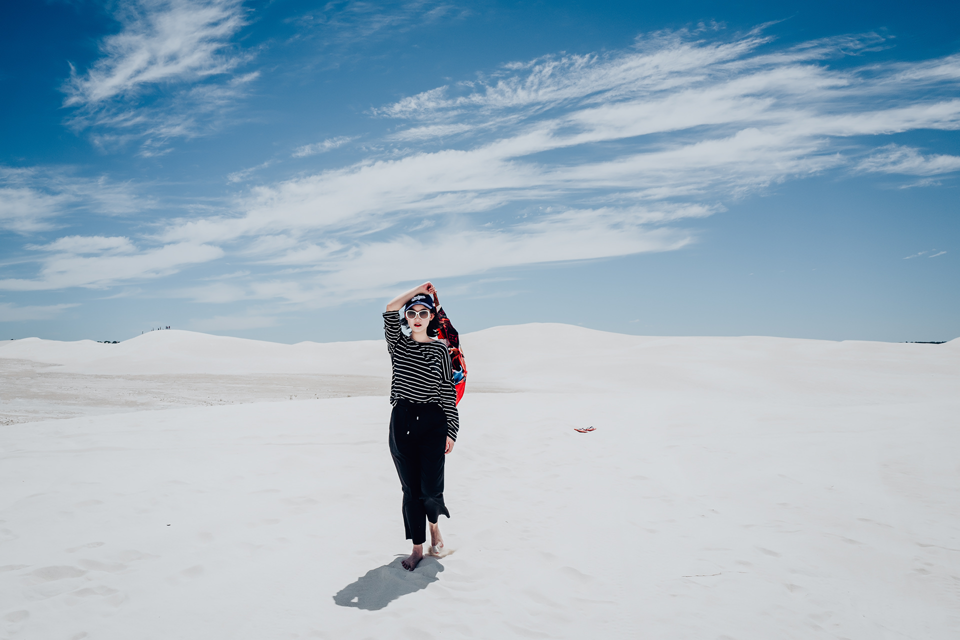 我们抵达兰斯林沙丘是在早上十点,这个时候整片沙丘没什么人,放眼望去,好像就只有我们两个人在沙丘上游玩。张老师作为新时代的宅女典范,平时在家基本上没事就足不出户,一根网线和一个爱奇艺会员就是她生活的全部,唯独出来旅行能够让她整个人都振奋起来。