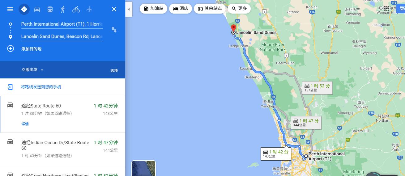 从珀斯出发,我们今天的第一站是著名的兰斯林白沙丘,打开导航一看一百多公里的路程不算太远,出发吧!
