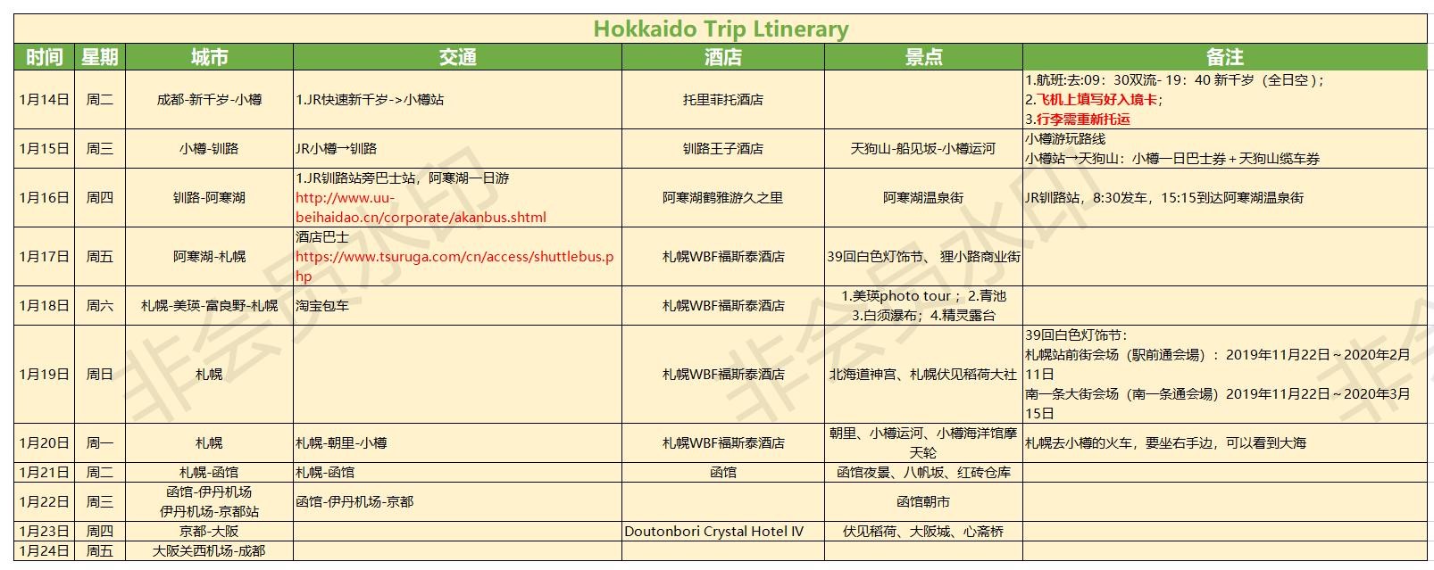 直接上行程表,实际的行程有路线重叠的部分,是因为原本只买了成都-札幌往返票,结果因为不愿舍弃心心念念的函馆,就重新买了函馆-大阪-成都的机票,多呆了4天