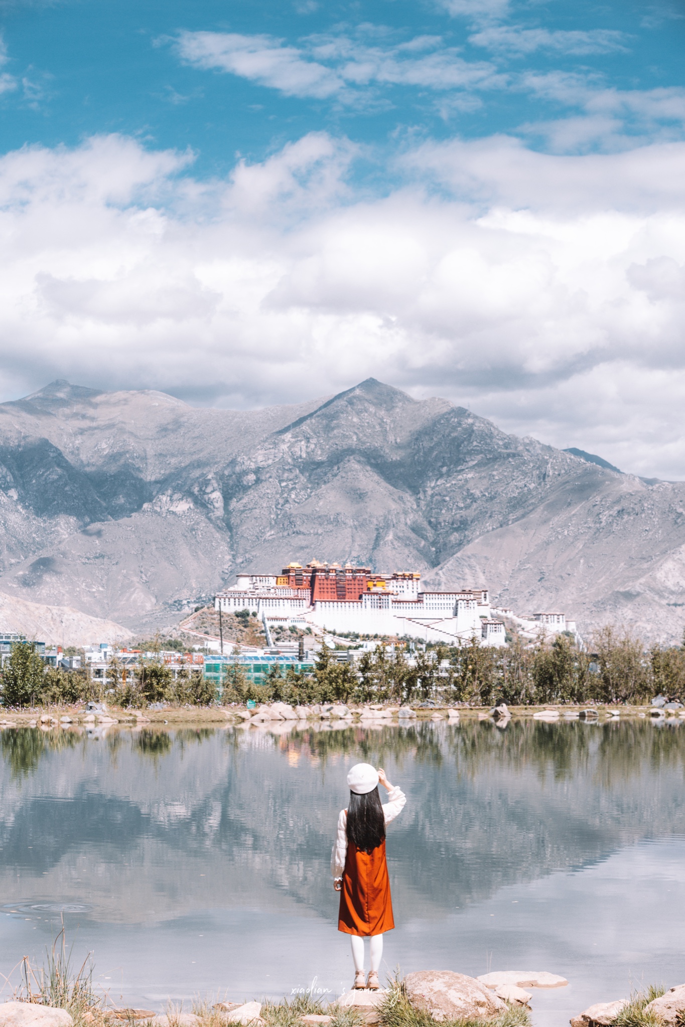 拍摄人与布宫合照的最好机位是湖边的石头上,或站或坐都可以,根据我们的拍摄经验来说坐下会更好看一些。