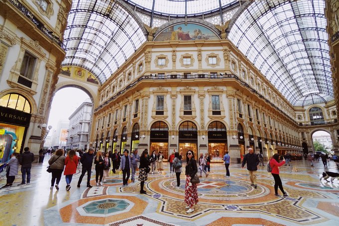 大教堂旁边就是米兰的另一个地标——埃马努埃莱二世长廊。这座长廊有着钢架结构的彩色玻璃棚顶,两侧林立着各种大牌名品店与咖啡店,长廊正中穹顶下方地面上有一只马赛克瓷砖拼接的公牛图案,当时看到一位妙龄女郎穿着高跟鞋在上面一直转,我还在疑惑这是在做什么,后来才听说,原来传说用脚后跟在公牛的不可描述部位上转三圈可以带来好运气。