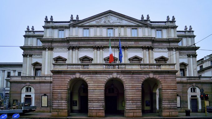 出了长廊另一侧没走几步就来到了斯卡拉歌剧院,春节的时候我看官网预告9月22日当天会上演威尔第的名作《弄臣》,当年帕瓦罗蒂第一次登上斯卡拉大剧院一举成名的作品,也正是这部名作。期待着7月放票,结果7月再去看剧目已经更换,就放弃了在这座世界歌剧殿堂观赏的想法。近距离用广角拍了一下斯卡拉歌剧院的外观,阴暗的天色下似乎平平无奇,但内部极其华丽,传说中世界上最完美的歌剧院。