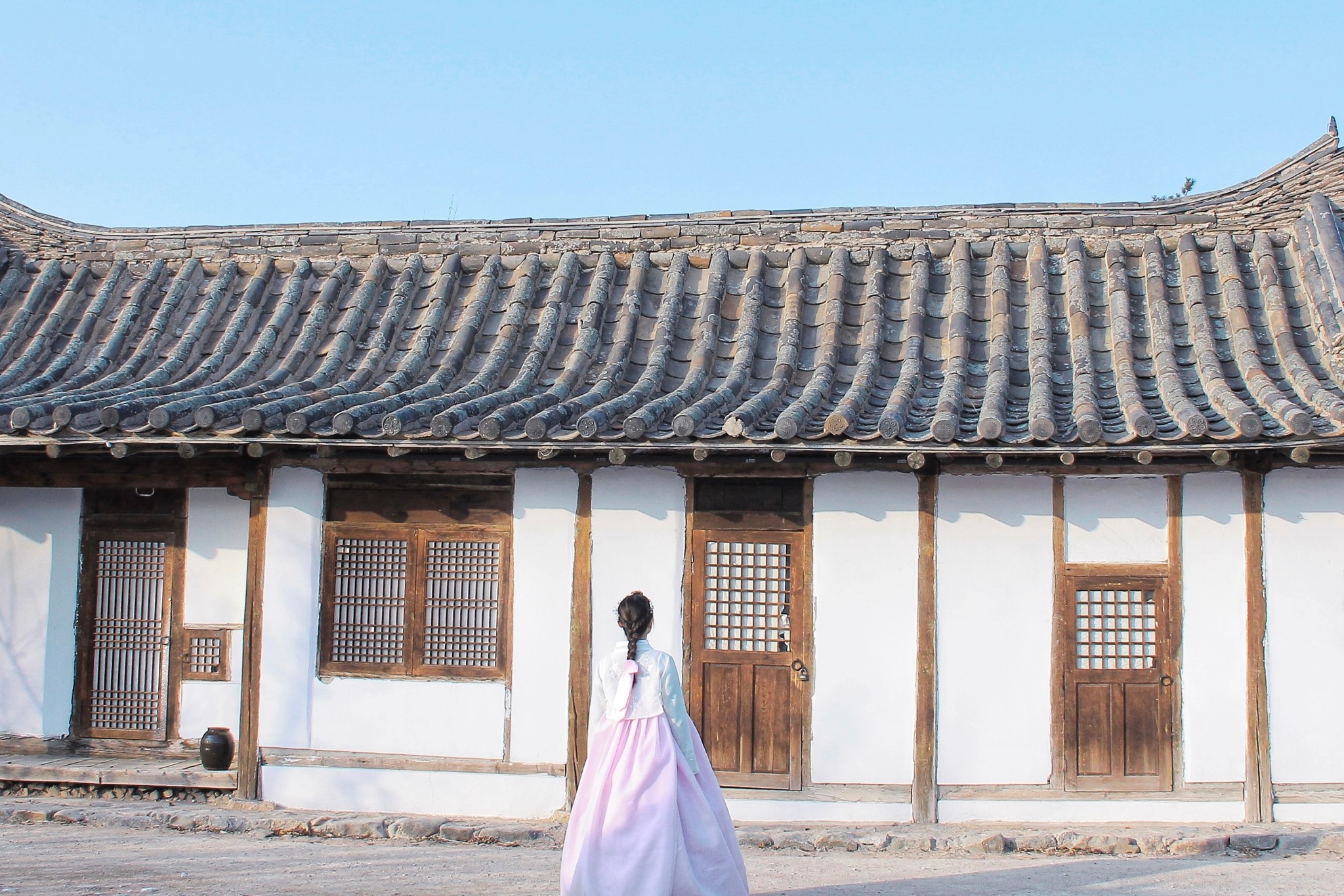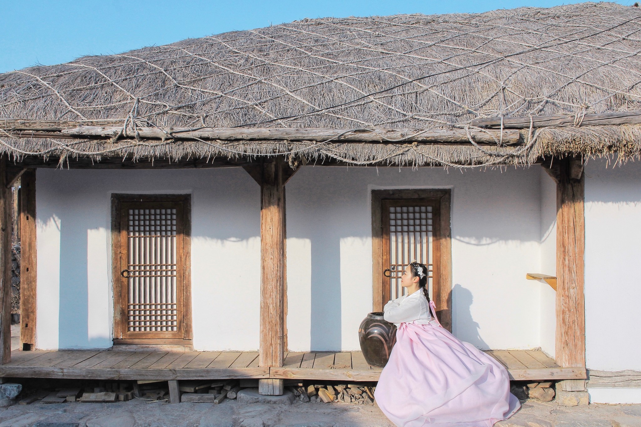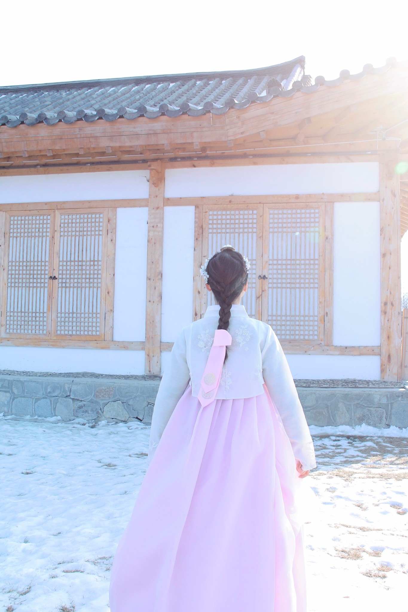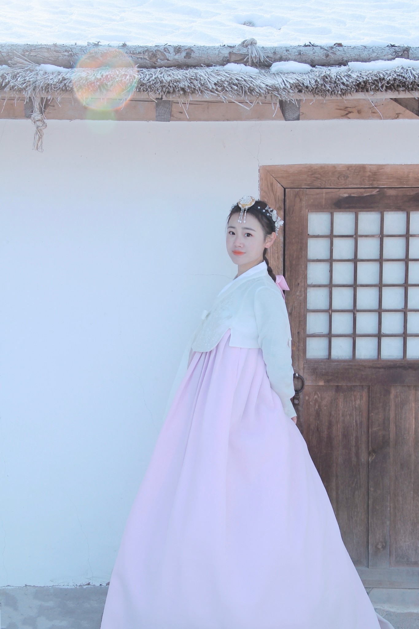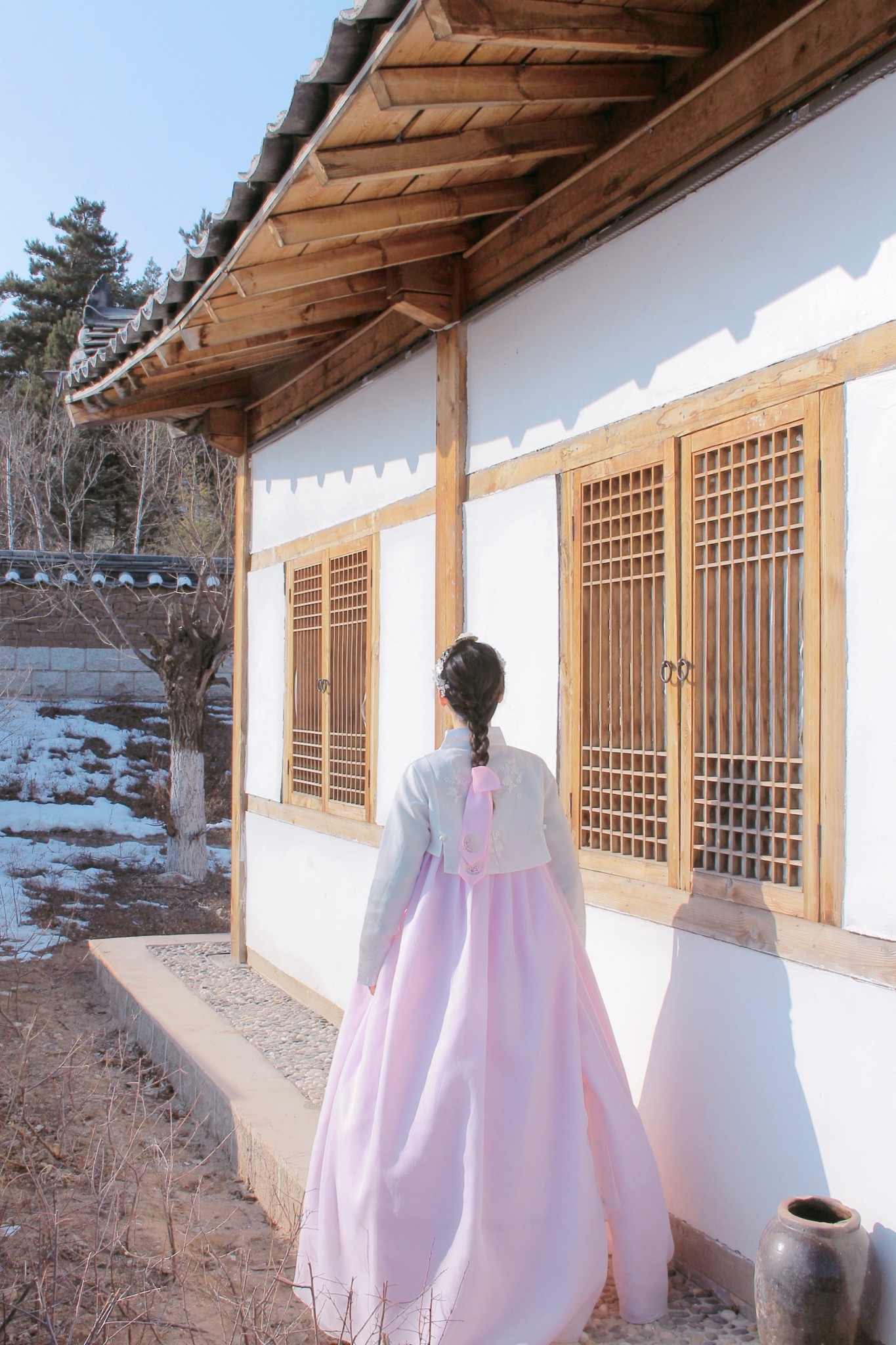 为了这身最近很火的朝鲜服,我阻止了小D用午餐,节省时间直奔民俗园。民俗园外有2家可以租朝鲜服的店,我提前预订了“绣佳人服饰”的这套白衣粉裙。店内的衣服租金都是100/套,编发和化妆分别50。我自己化妆,选择了编发,人多时需要排队,但是5分钟就能做好。