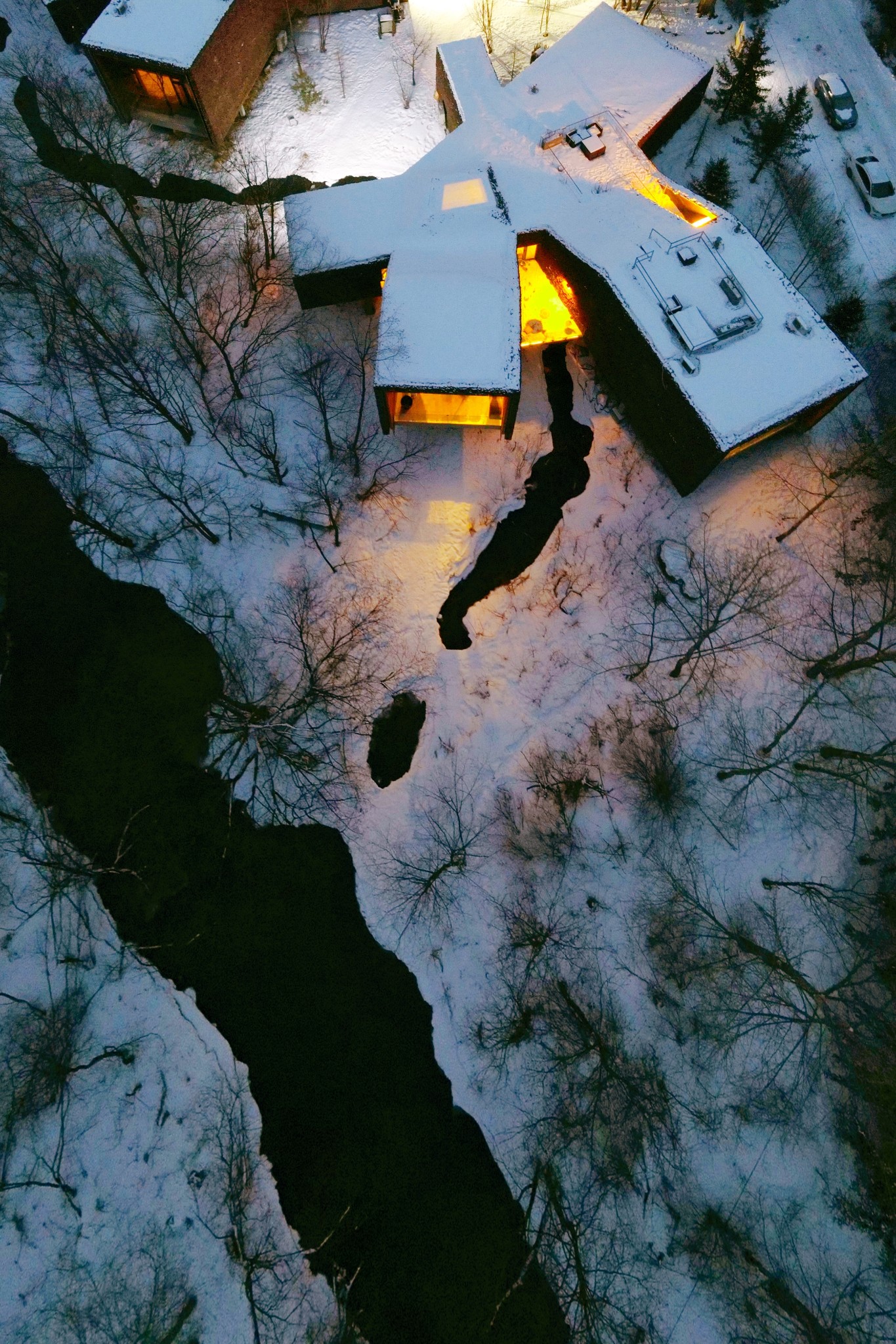 ▲ 万物覆雪,无人涉足;置身雪溪上的玻璃屋,耳边只有雪落的声音。