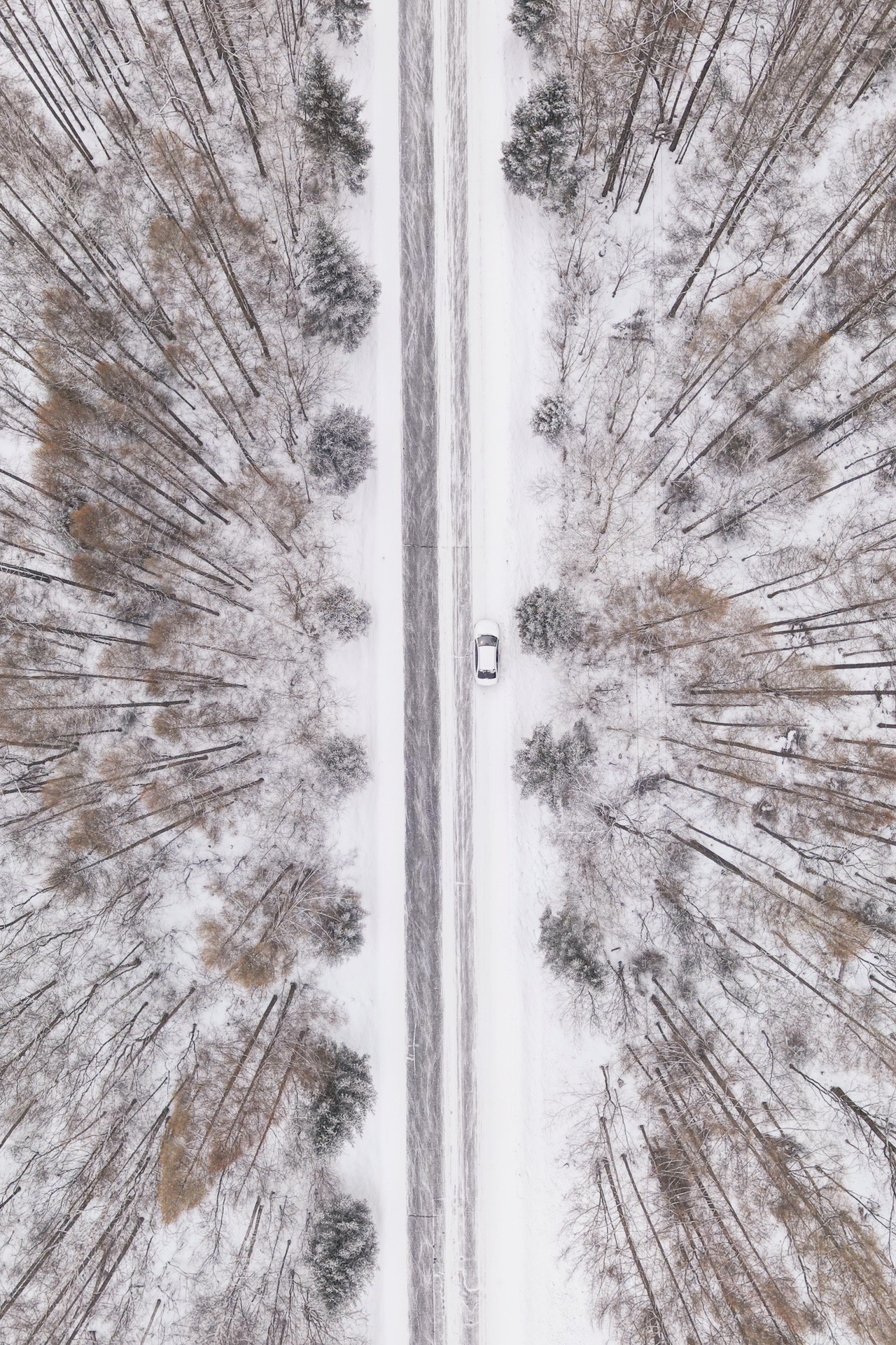 正巧当天下起了一场大雪,公路两旁的白桦林和圣诞树都挂满了雪淞,死寂、空旷、寂寥,就像进入了一片沉寂的冰封世界。