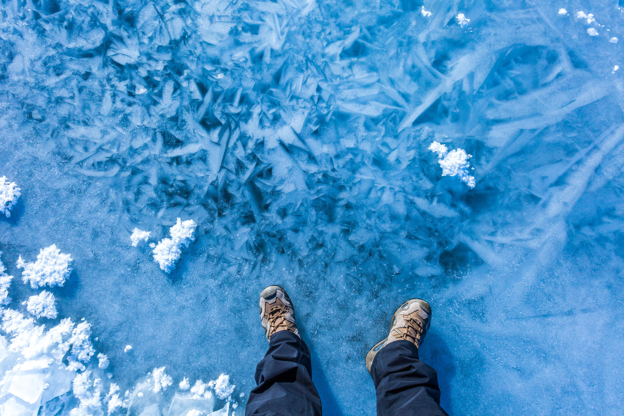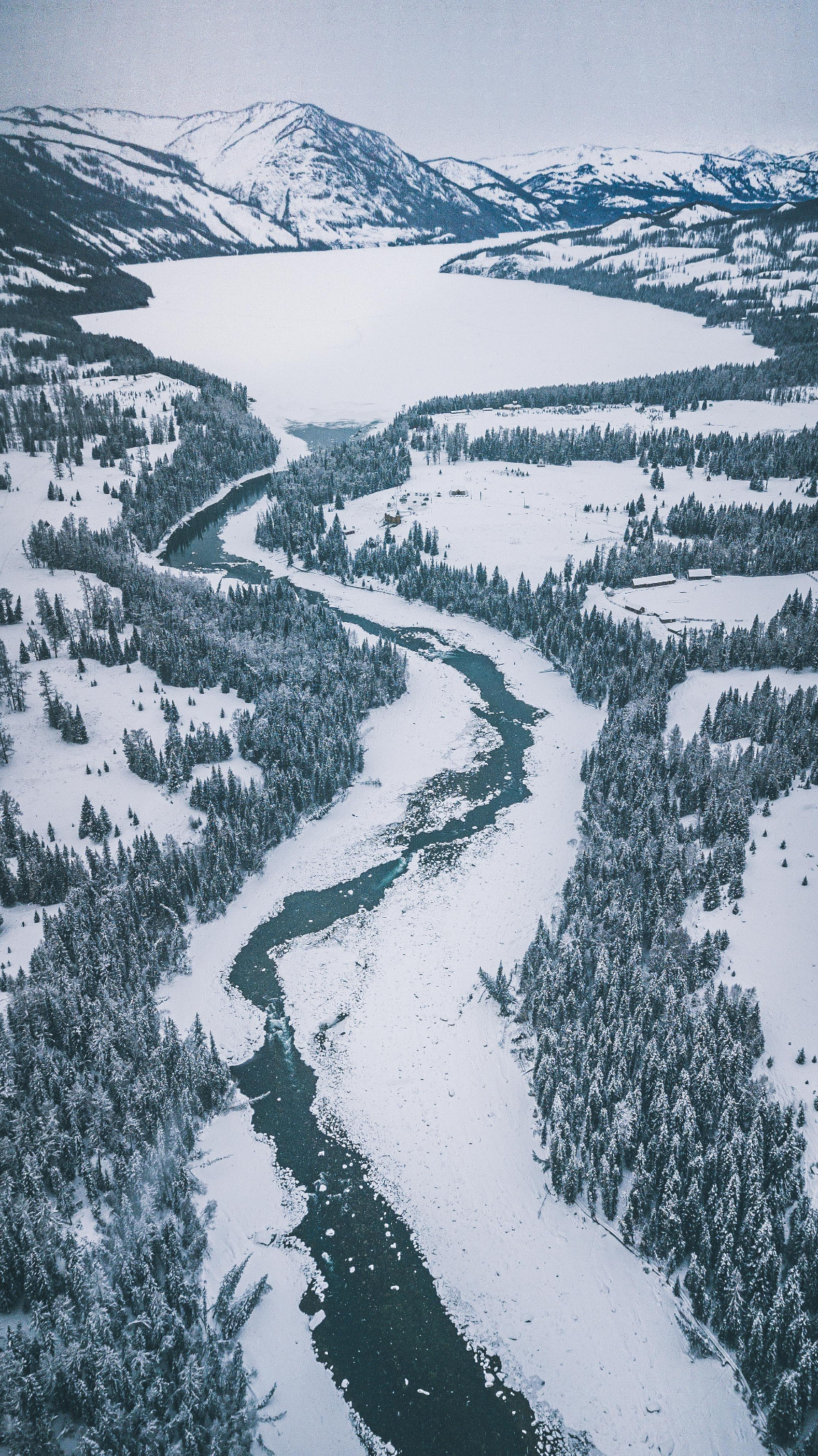 冬天的喀纳斯湖整个冰封,被白雪覆盖。冰面下的湖水,依旧保持着较高的水温,湖水从冰面下涌出,带着清澈的冰川融水流向山下。
