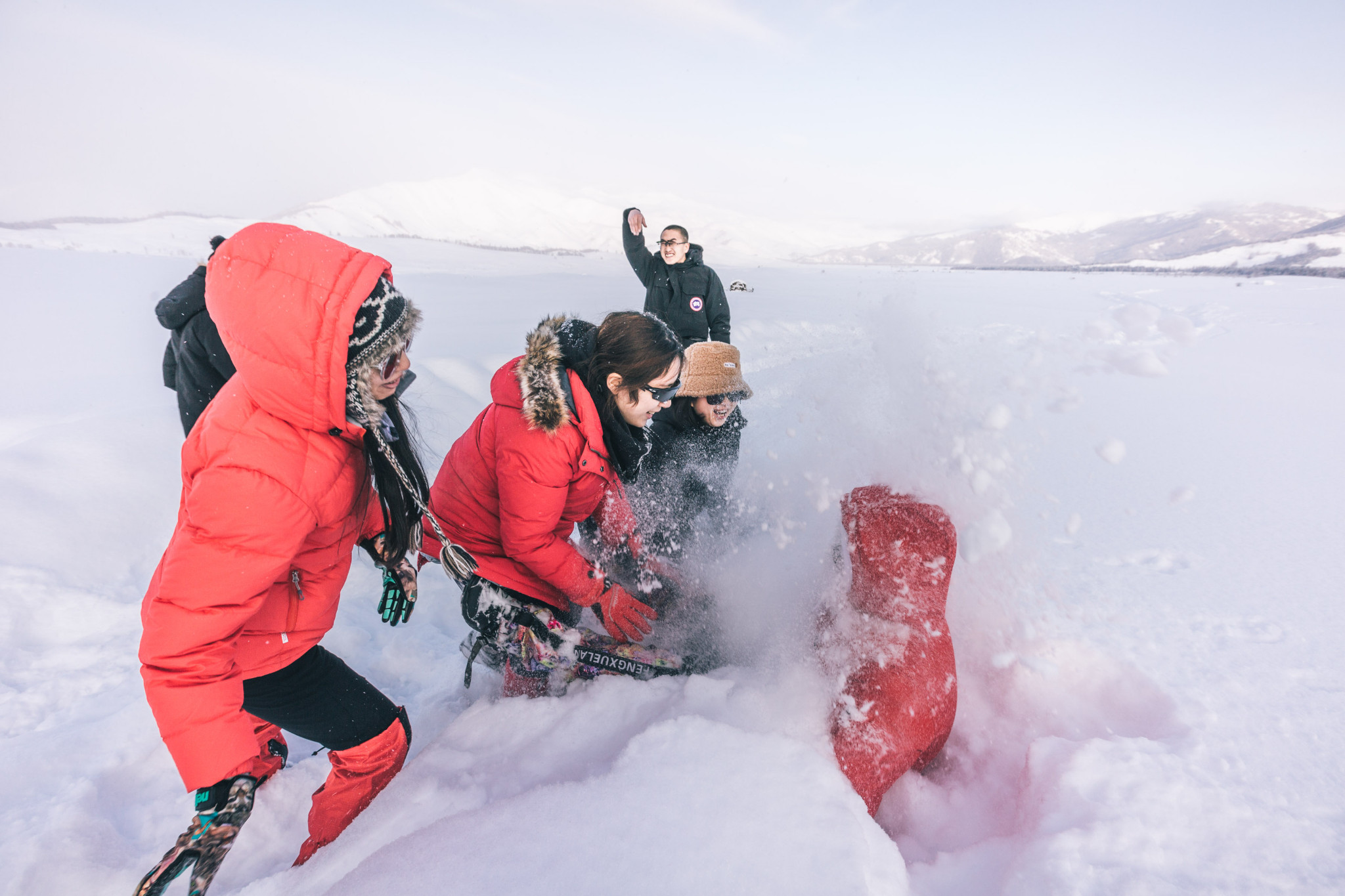 我是跟一群有趣的小伙伴包车去的,司机给我们找了一处“秘密基地”,雪的厚度在半米-1米左右,两位司机大哥,拎起一个小姑娘就往雪地里扔!!!