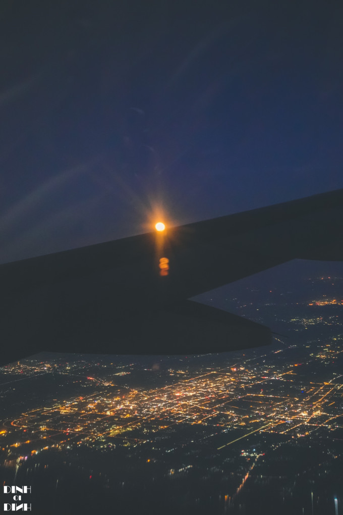 机翼上那个很亮的光源是月亮,上回看到那么大那么亮的月亮是在越南过中秋的时候,这回在天上赏月。不知道路过哪个城市,横平竖直的马路,华灯初上时的样子真美。